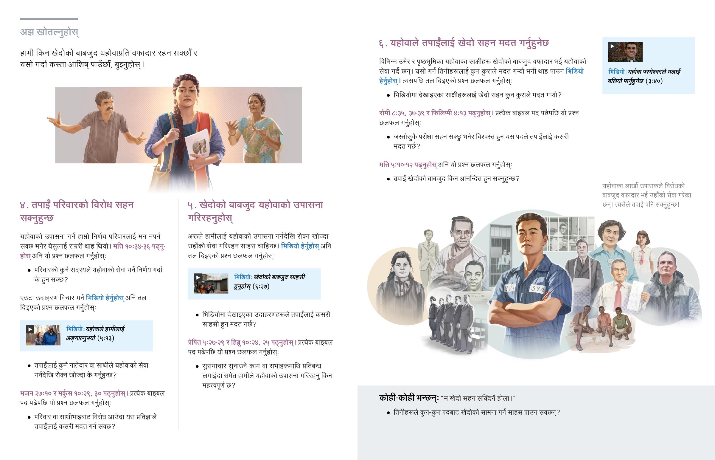 विभिन्न उमेर र पृष्ठभूमिका यहोवाका साक्षीहरू खेदोको बाबजुद वफादार भई यहोवाको सेवा गर्दै छन्। यसो गर्न तिनीहरूलाई कुन कुराले मदत गऱ्यो भनी थाह पाउन भिडियो हेर्नुहोस्। त्यसपछि तल दिइएको प्रश्न छलफल गर्नुहोस्: