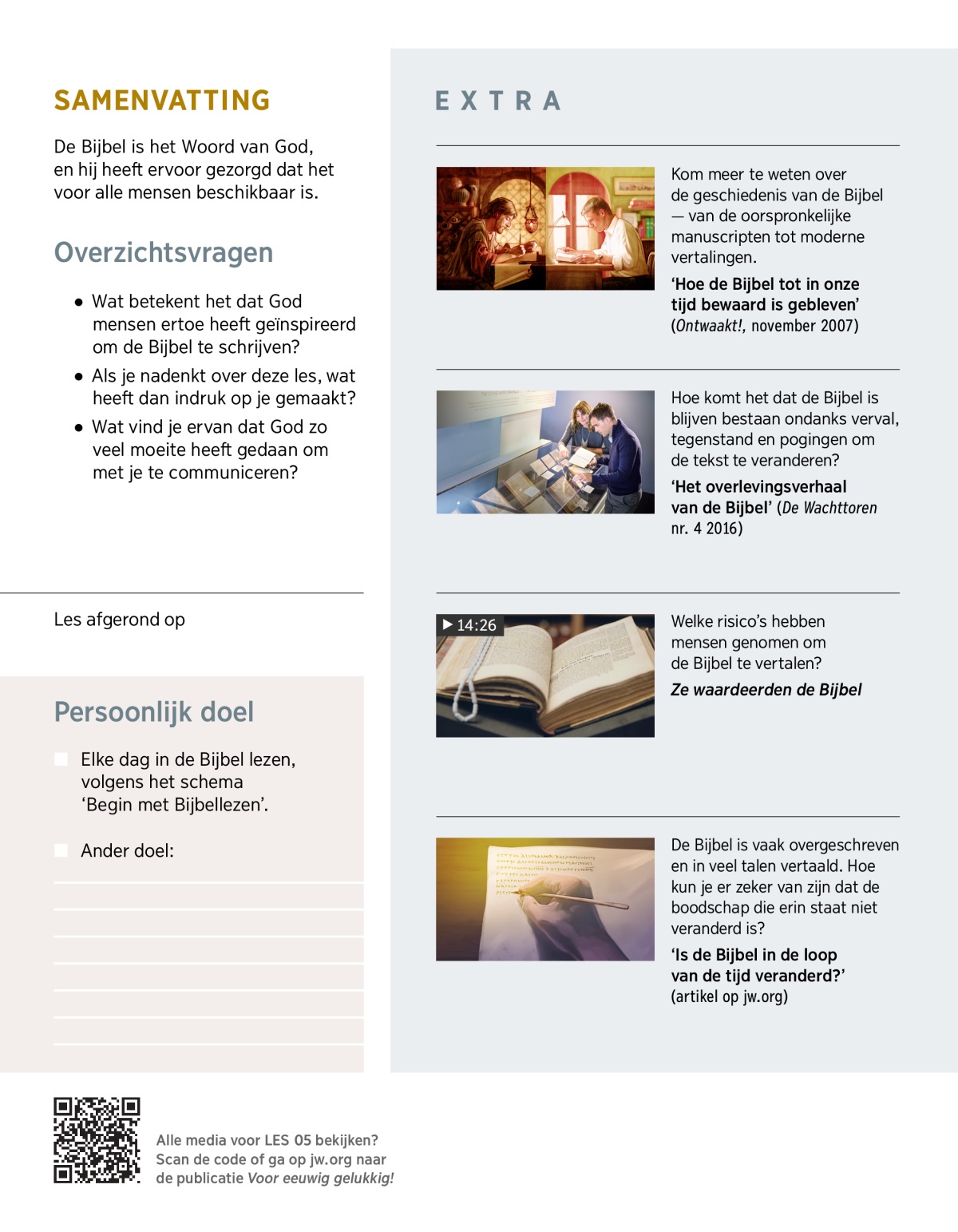 Bekijk de VIDEO. Lees 2 Timotheüs 3:16. Bespreek daarna de gespreksvragen.