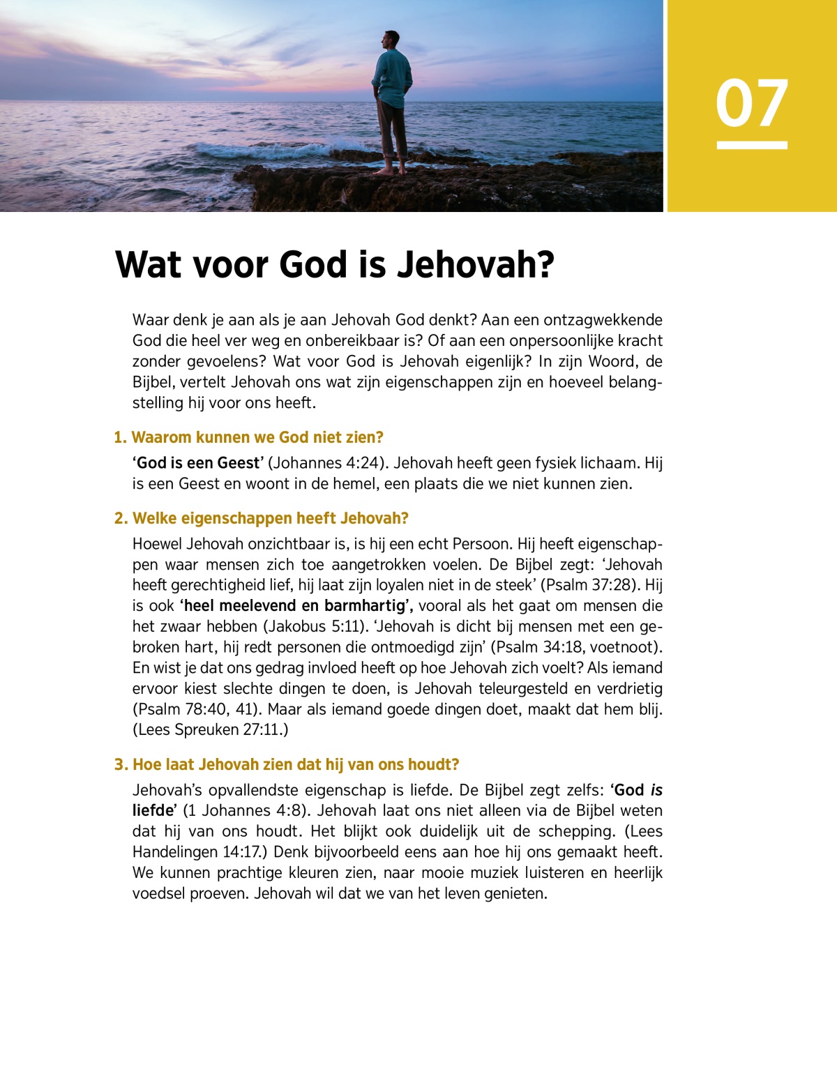 Waar denk je aan als je aan Jehovah God denkt? Aan een ontzagwekkende God die heel ver weg en onbereikbaar is? Of aan een onpersoonlijke kracht zonder gevoelens? Wat voor God is Jehovah eigenlijk? In zijn Woord, de Bijbel, vertelt Jehovah ons wat zijn eigenschappen zijn en hoeveel belangstelling hij voor ons heeft.