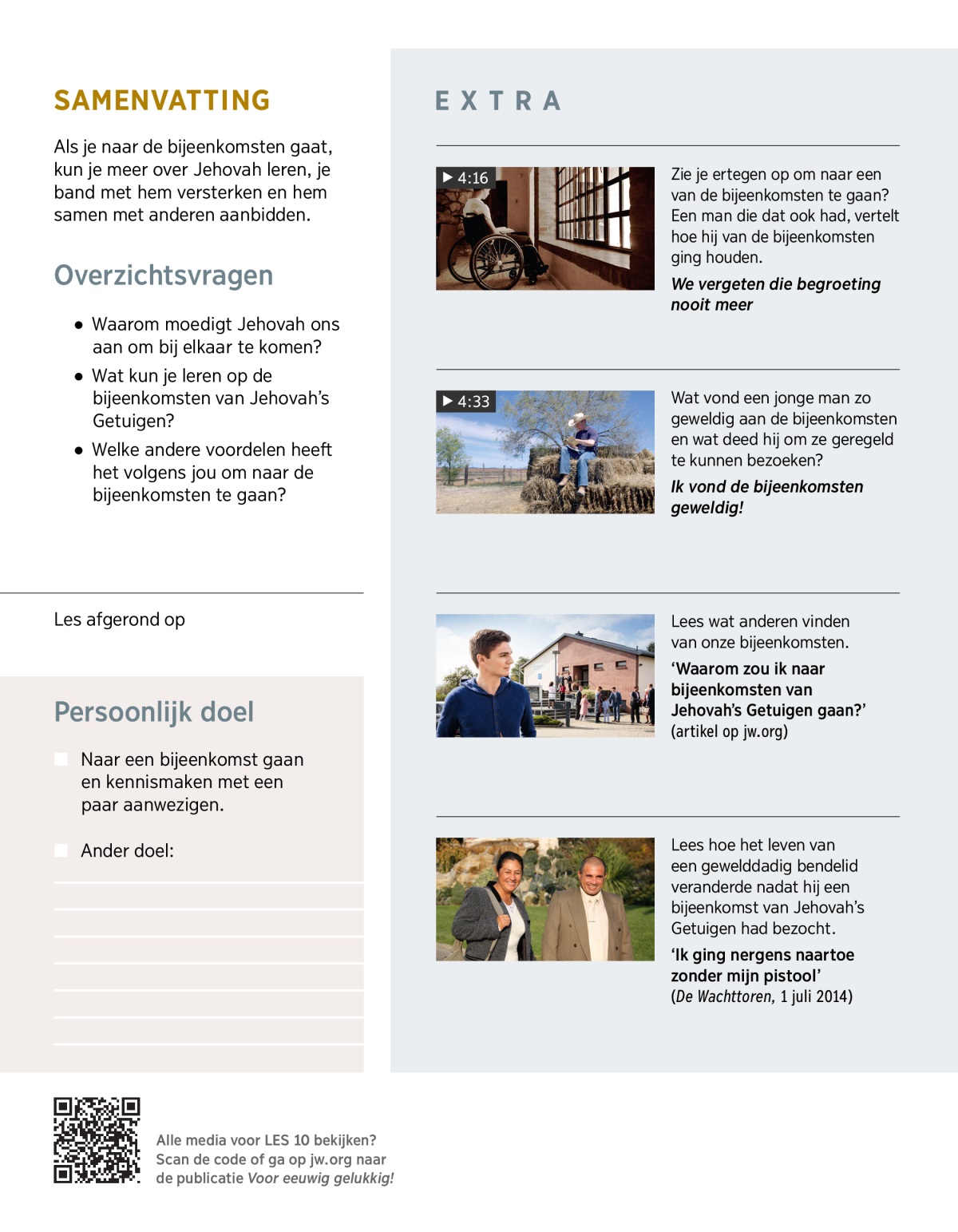 Heeft iemand je weleens uitgenodigd voor een bijeenkomst van Jehovah’s Getuigen? Als je er nog nooit één hebt bezocht, zie je daar misschien een beetje tegen op. Misschien vraag je je af: Wat gebeurt er op die bijeenkomsten? Waarom zijn ze belangrijk? Waarom zou ik ernaartoe gaan? In deze les zul je zien hoe bijeenkomen met anderen je kan helpen en je band met God kan versterken.