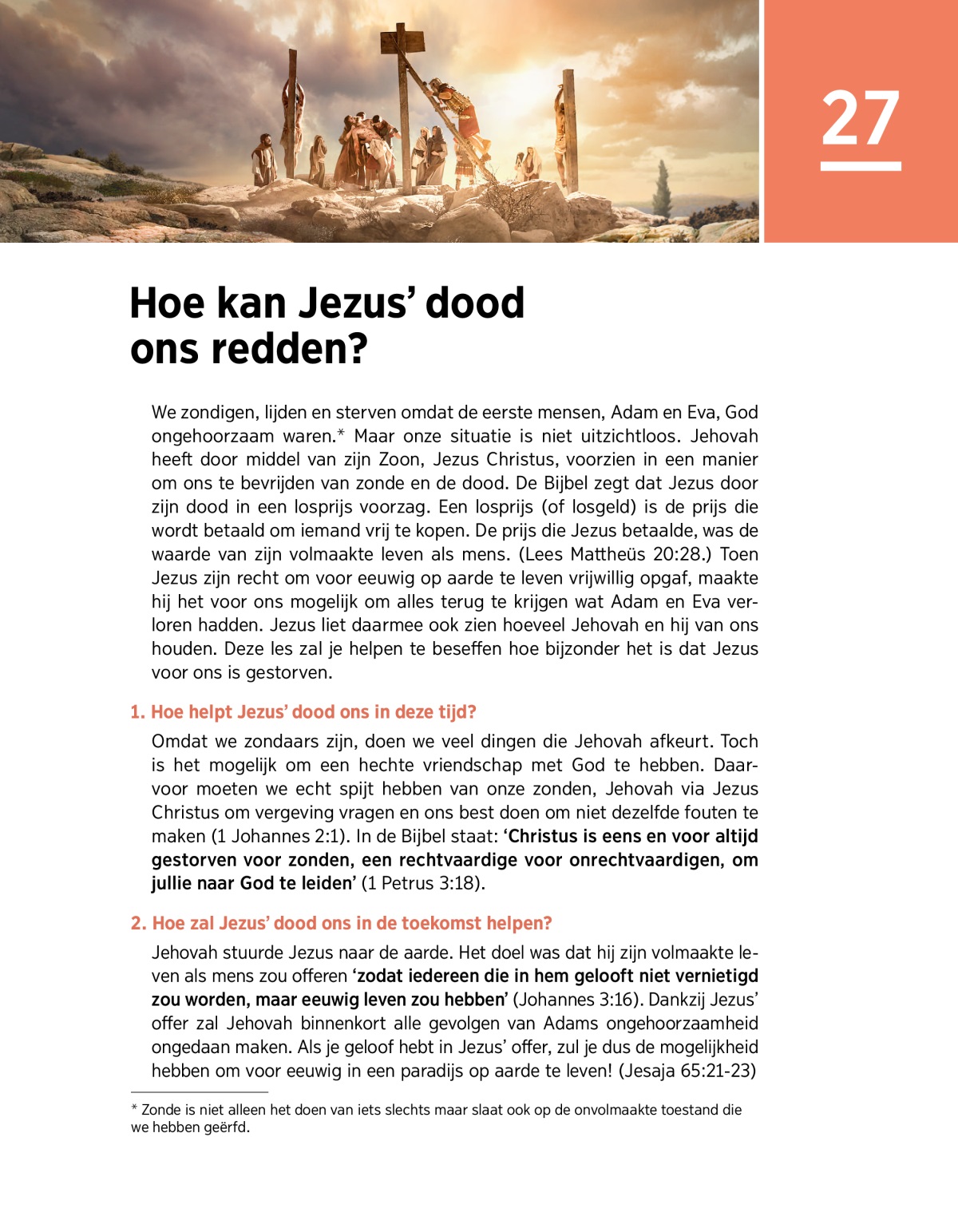 We zondigen, lijden en sterven omdat de eerste mensen, Adam en Eva, God ongehoorzaam waren.a Maar onze situatie is niet uitzichtloos. Jehovah heeft door middel van zijn Zoon, Jezus Christus, voorzien in een manier om ons te bevrijden van zonde en de dood. De Bijbel zegt dat Jezus door zijn dood in een losprijs voorzag. Een losprijs (of losgeld) is de prijs die wordt betaald om iemand vrij te kopen. De prijs die Jezus betaalde, was de waarde van zijn volmaakte leven als mens. (Lees Mattheüs 20:28.) Toen Jezus zijn recht om voor eeuwig op aarde te leven vrijwillig opgaf, maakte hij het voor ons mogelijk om alles terug te krijgen wat Adam en Eva verloren hadden. Jezus liet daarmee ook zien hoeveel Jehovah en hij van ons houden. Deze les zal je helpen te beseffen hoe bijzonder het is dat Jezus voor ons is gestorven.