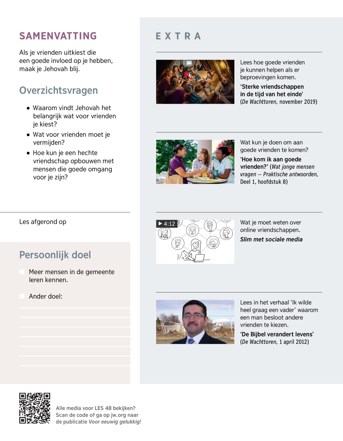 Vaak gaan we lijken op de mensen met wie we tijd doorbrengen. Dat kan positief of negatief uitpakken, en daarbij maakt het niet uit of we persoonlijk contact met ze hebben of via sociale media. De Bijbel zegt: ‘Wie met wijzen omgaat wordt wijs, maar wie zich met dwazen [mensen die niet van Jehovah houden] inlaat zal het slecht vergaan’ (Spreuken 13:20). Vrienden die van Jehovah houden en hem aanbidden, kunnen je helpen om je band met hem sterk te houden en goede beslissingen te nemen. Maar vrienden buiten de gemeente kunnen ervoor zorgen dat je band met Jehovah verzwakt. Het is dus niet zo vreemd dat de Bijbel zegt dat we er goed over na moeten denken welke vrienden we kiezen! Als je vrienden net als jij van God houden, zullen jullie een goede invloed op elkaar hebben. Dan kunnen jullie ‘elkaar blijven aanmoedigen en opbouwen’ (1 Thessalonicenzen 5:11).