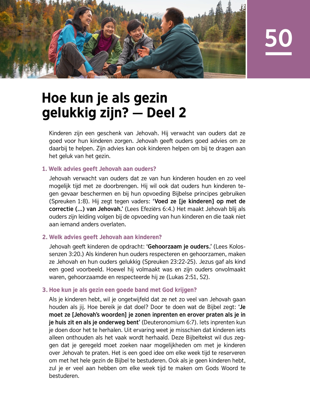 Kinderen zijn een geschenk van Jehovah. Hij verwacht van ouders dat ze goed voor hun kinderen zorgen. Jehovah geeft ouders goed advies om ze daarbij te helpen. Zijn advies kan ook kinderen helpen om bij te dragen aan het geluk van het gezin.
