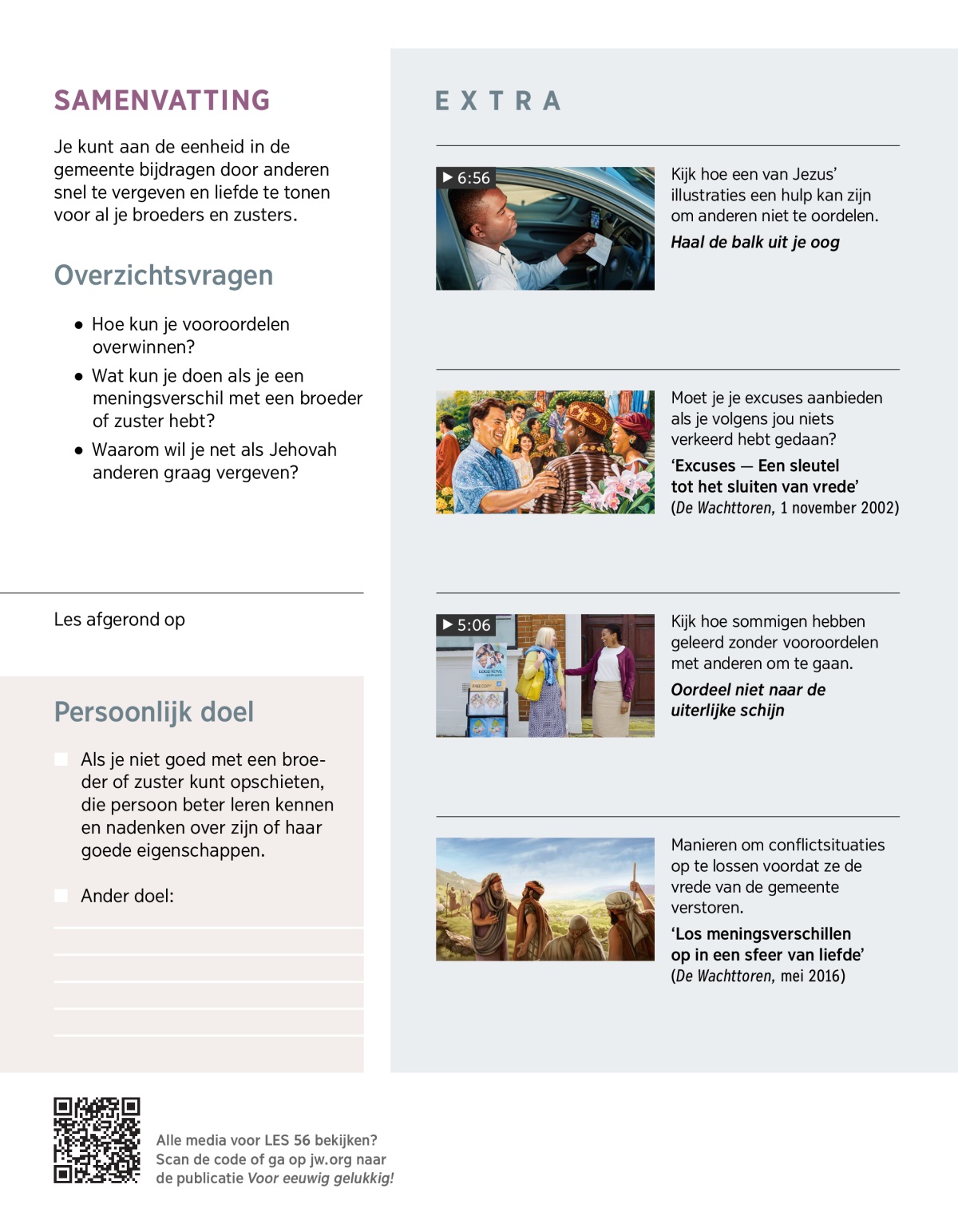 Hoewel er eenheid onder ons is, zijn we nog steeds onvolmaakt. Soms stellen we elkaar teleur of doen we elkaar zelfs pijn. Daarom moedigt Gods Woord ons aan: ‘Blijf (...) elkaar van harte vergeven.’ Ook staat er: ‘Zoals Jehovah jullie van harte vergeven heeft, zó moeten jullie vergeven.’ (Lees Kolossenzen 3:13.) We hebben Jehovah heel vaak pijn gedaan, en toch heeft hij ons vergeven. Dus verwacht hij van ons dat we onze broeders en zusters vergeven. Als je merkt dat je iemand hebt gekwetst, neem dan het initiatief om het goed te maken. (Lees Mattheüs 5:23, 24.)b