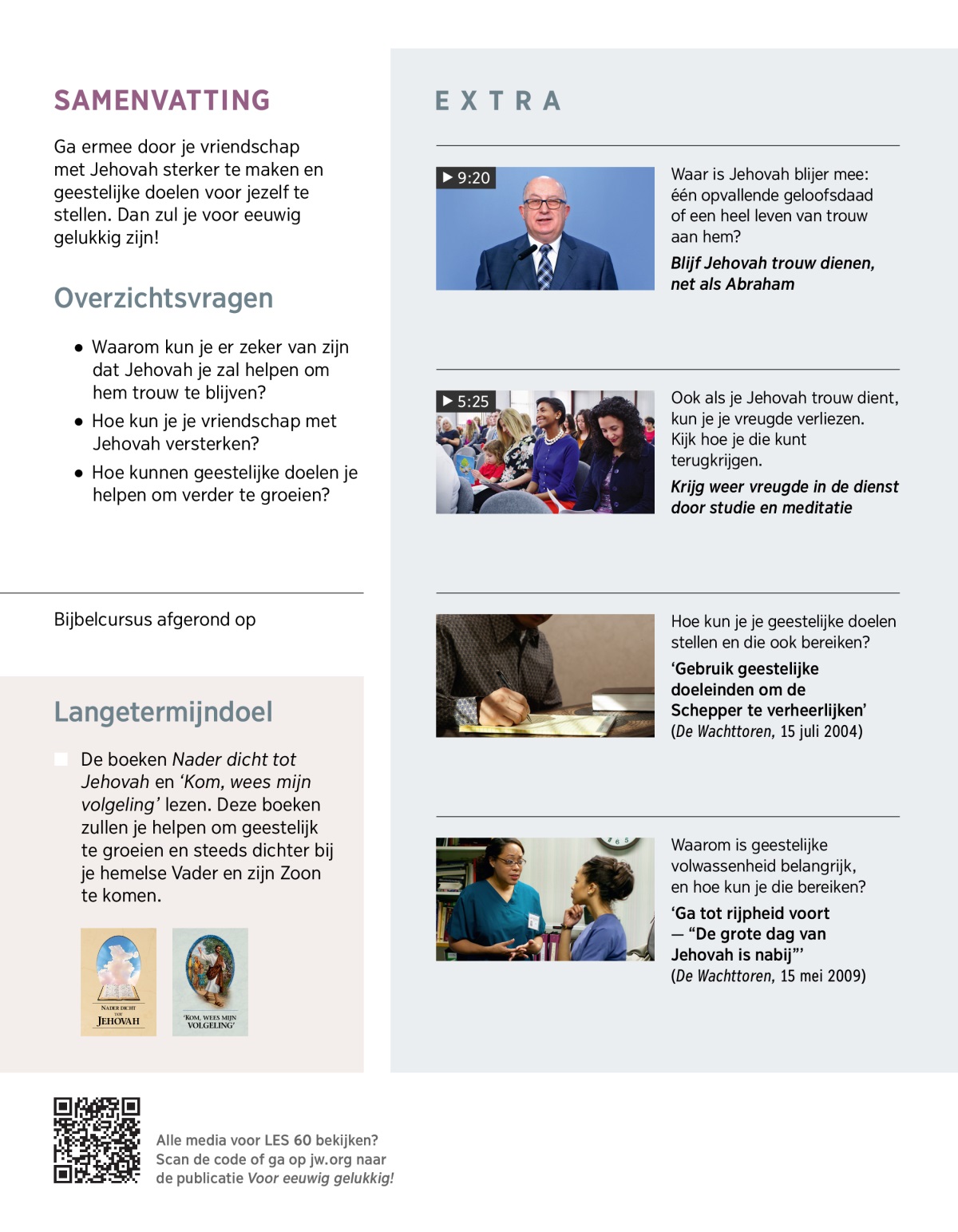Ga ermee door je vriendschap met Jehovah sterker te maken en geestelijke doelen voor jezelf te stellen. Dan zul je voor eeuwig gelukkig zijn!
