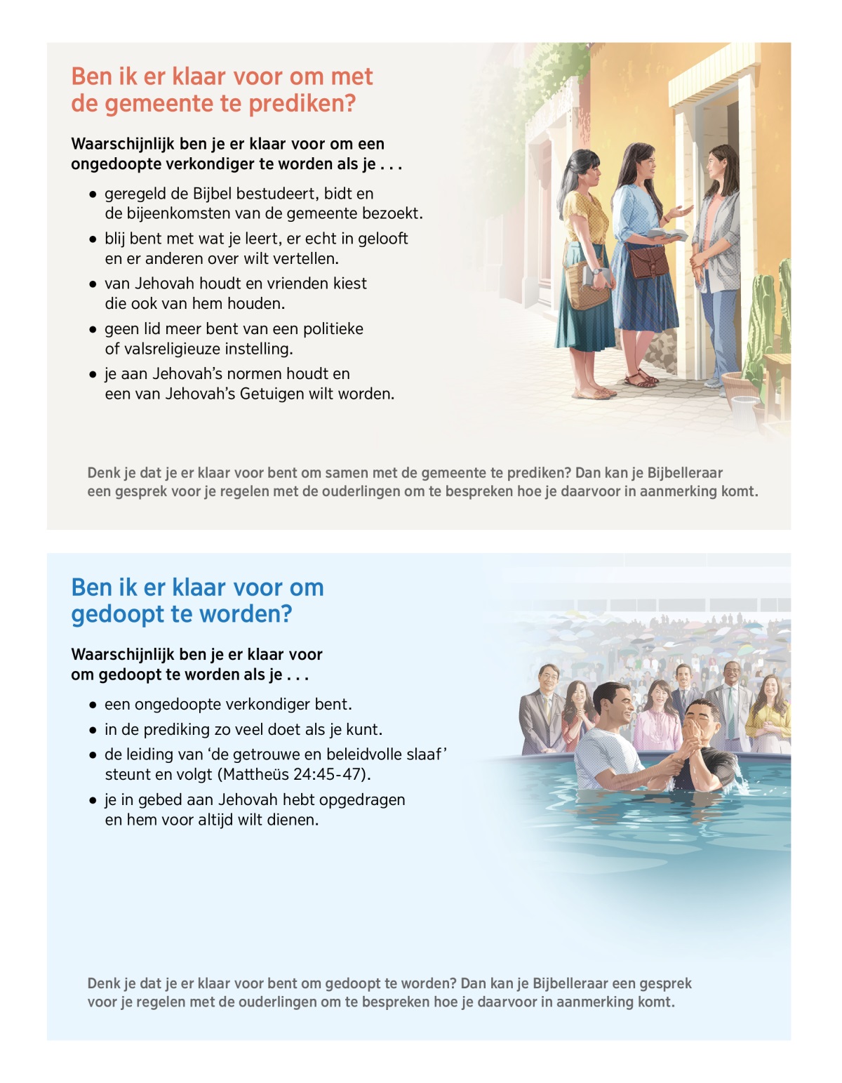 Denk je dat je er klaar voor bent om gedoopt te worden? Dan kan je Bijbelleraar een gesprek voor je regelen met de ouderlingen om te bespreken hoe je daarvoor in aanmerking komt.