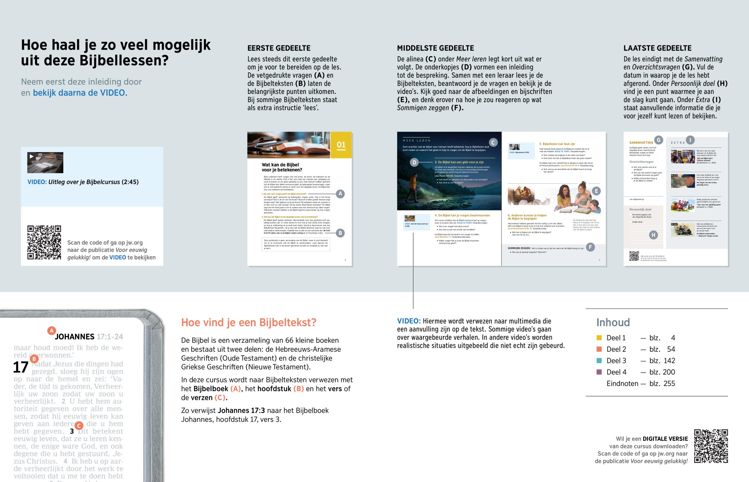 De alinea (C) onder Meer leren legt kort uit wat er volgt. De onderkopjes (D) vormen een inleiding tot de bespreking. Samen met een leraar lees je de Bijbelteksten, beantwoord je de vragen en bekijk je de video’s.