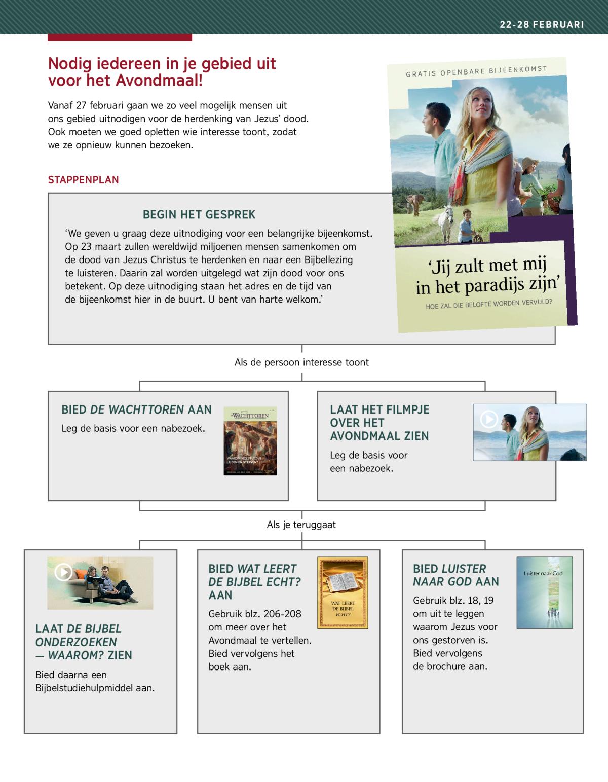 Vanaf 27 februari gaan we zo veel mogelijk mensen uit ons gebied uitnodigen voor de herdenking van Jezus’ dood. Ook moeten we goed opletten wie interesse toont, zodat we ze opnieuw kunnen bezoeken.
