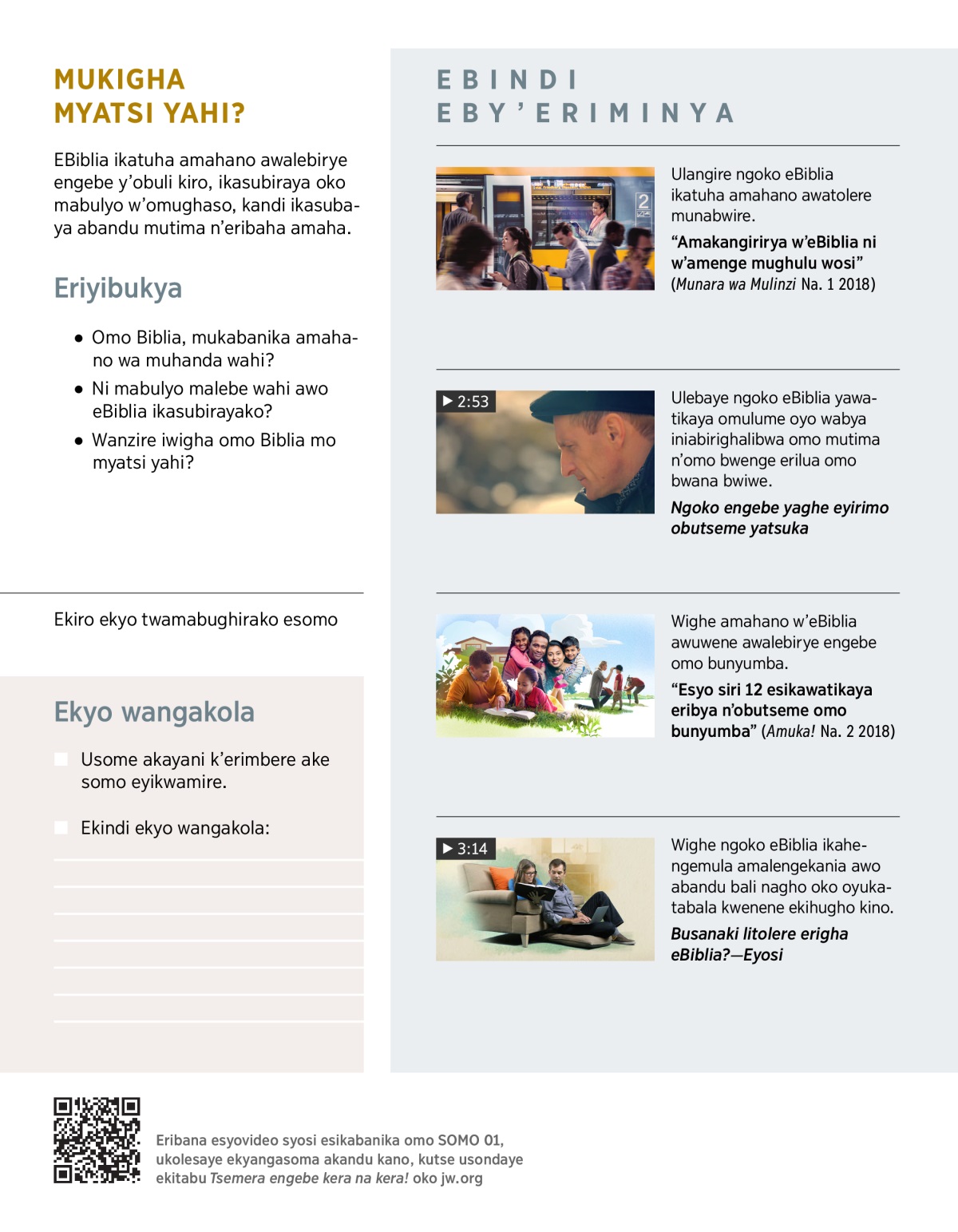 Abandu bangyi bakatsemera erisoma eBiblia, kandi inemubawatikya. Mukwame EVIDEO, neryo musubiraye oko mabulyo awakwamire.