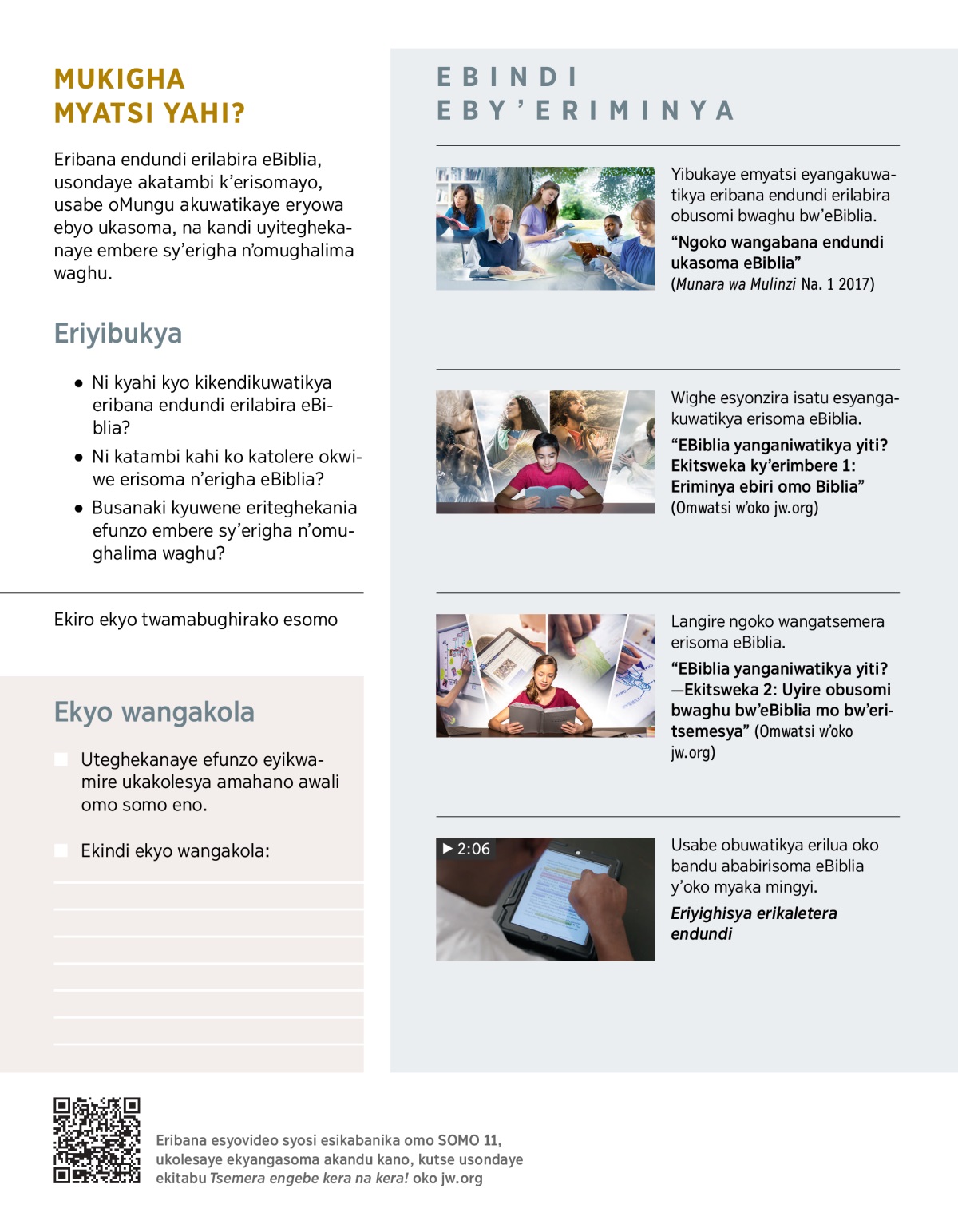 Wamanza uti eBiblia ikuwatikaye, omughulu ukasomayo ni ky’omughaso eriluhuka hake n’erilengekania buli oko ebyo ukasoma. Utolere iwasomayo “n’erighaniryayo.” (Yosua 1:8) Ukasomayo, yibulaye amabulyo ng’ano: ‘Omwatsi ono amanighisyaki oko Yehova Mungu? Nangakolesya niti ebyo ngigha omo ngebe yaghe? Nangakolesya emilondo eyi yo niti nitoke eriwatikya abandi?’