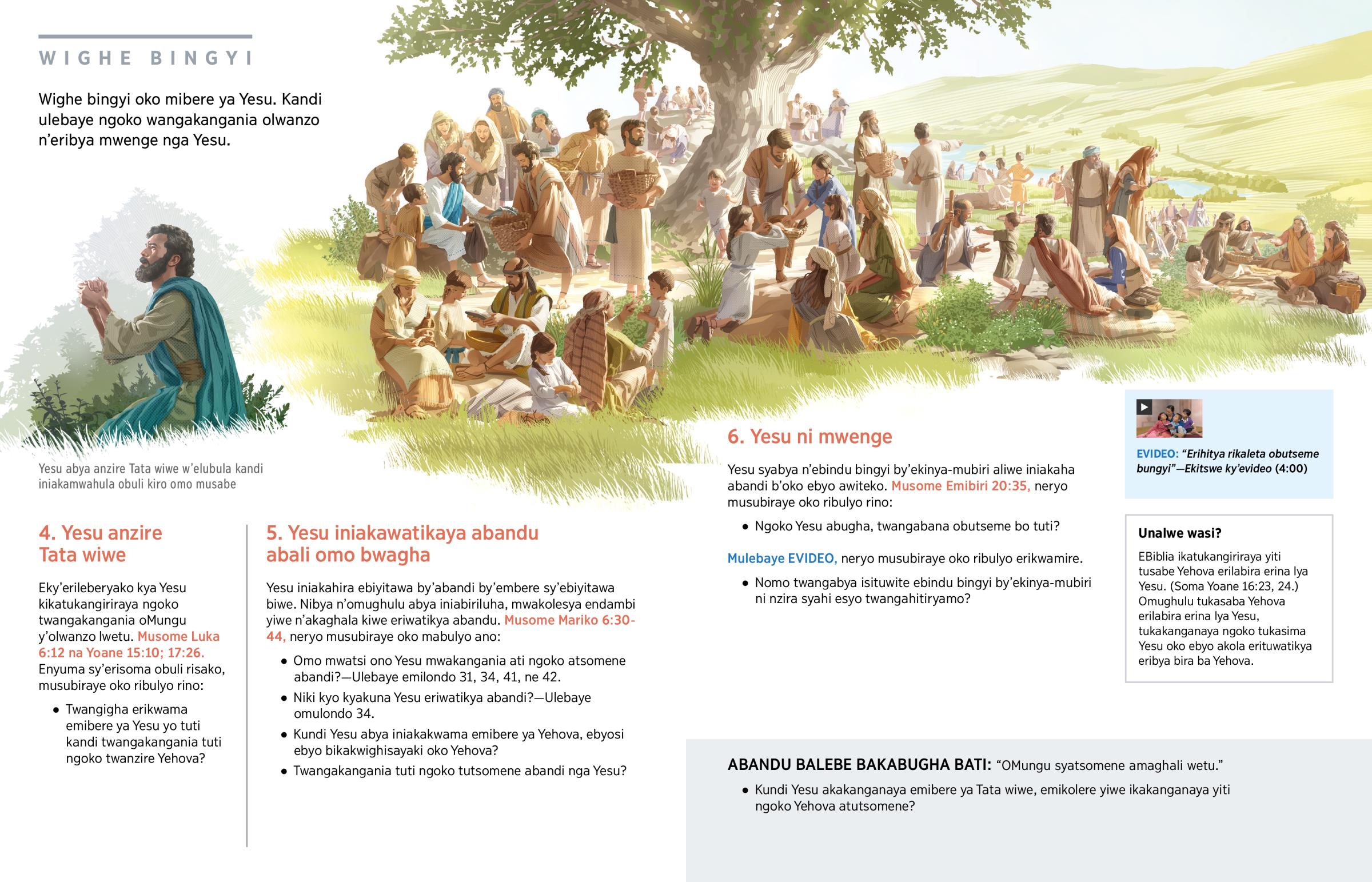 Elubula, Yesu mwalangira ngoko Tata wiwe akakola kandi abirigha myatsi mingyi okwiye omo myaka mingyi kutsibu. Busana n’ekyo, akalengekanaya, akayowa, kandi akakola nga Tata wiwe. (Soma Yoane 5:19.) Yesu akakanganaya emibere ya Tata wiwe yo ndeke-ndeke; kyo kyaleka iniabugha ati: “Oyo wamanyilangira iniabirilangira Tata.” (Yoane 14:9) Omughulu ukigha emibere ya Yesu, ikakuwatikaya eriminya Yehova yo ndeke. Eky’erileberyako, Yesu abya akakwira abandu b’obulighe, neryo ekyo kikakanganaya ngoko Yehova naye akakukwira obulighe.