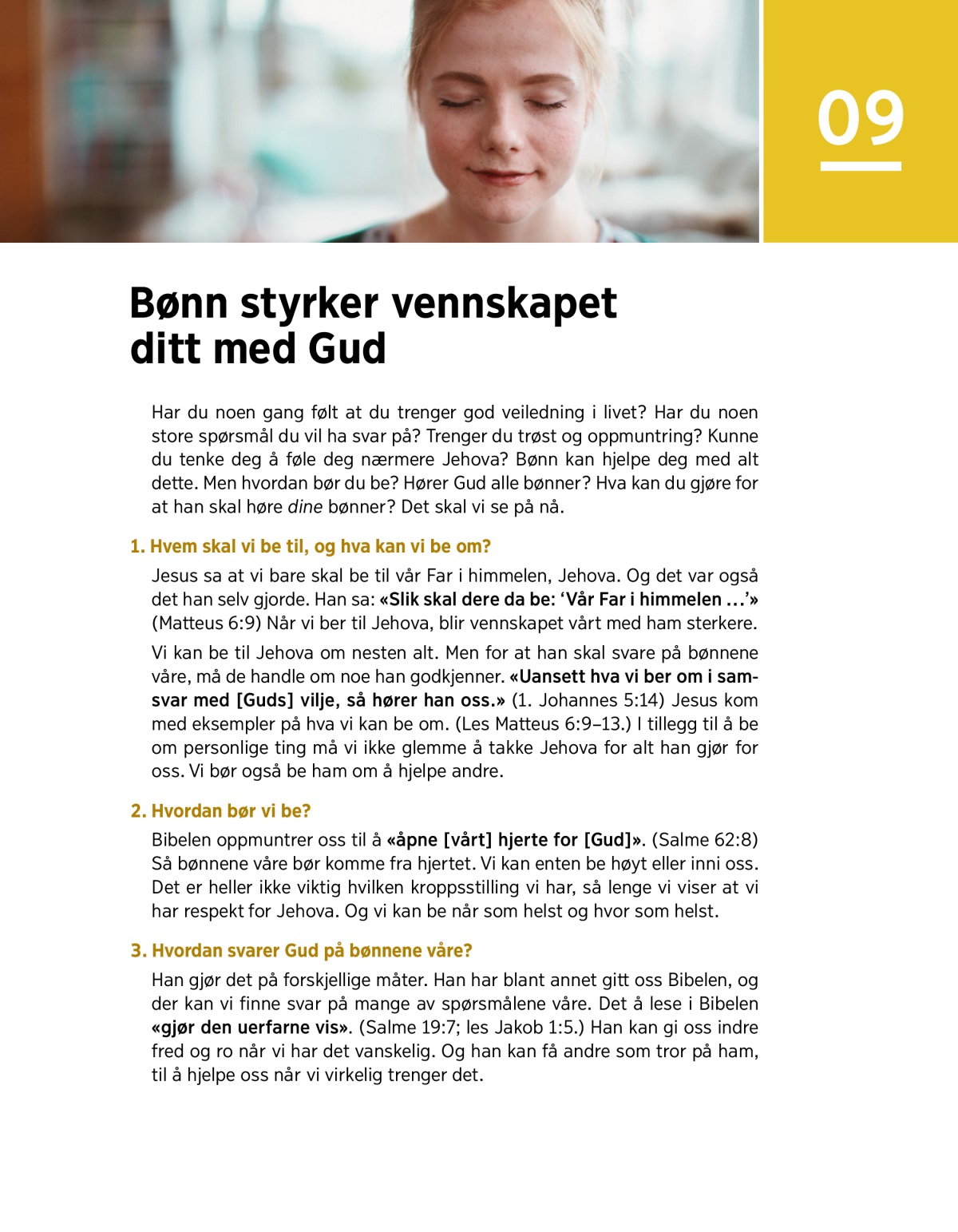Har du noen gang følt at du trenger god veiledning i livet? Har du noen store spørsmål du vil ha svar på? Trenger du trøst og oppmuntring? Kunne du tenke deg å føle deg nærmere Jehova? Bønn kan hjelpe deg med alt dette. Men hvordan bør du be? Hører Gud alle bønner? Hva kan du gjøre for at han skal høre dine bønner? Det skal vi se på nå.