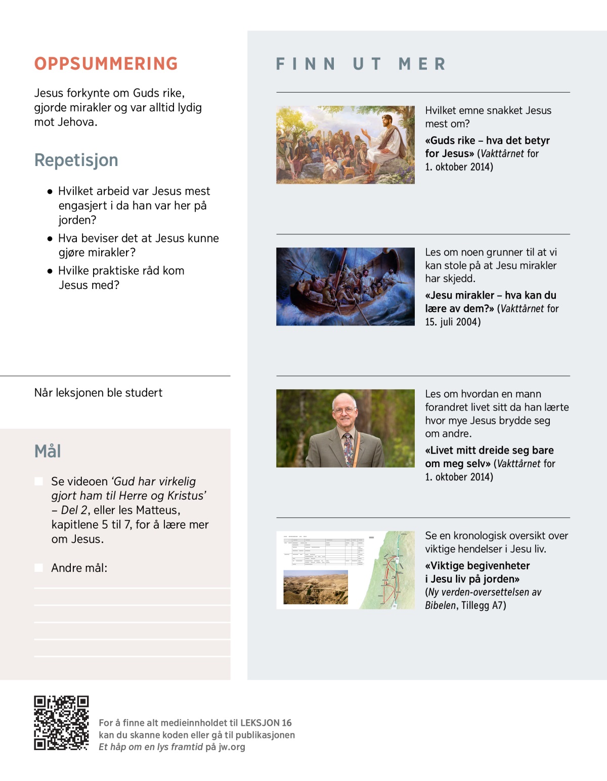 Mange tenker på Jesus enten som en liten baby, en vis profet eller en døende mann. Men kan vi lære mer om ham ved å undersøke hva han gjorde da han var her på jorden? I denne leksjonen skal vi se nærmere på noe av det viktigste Jesus gjorde, og hva det kan bety for deg.