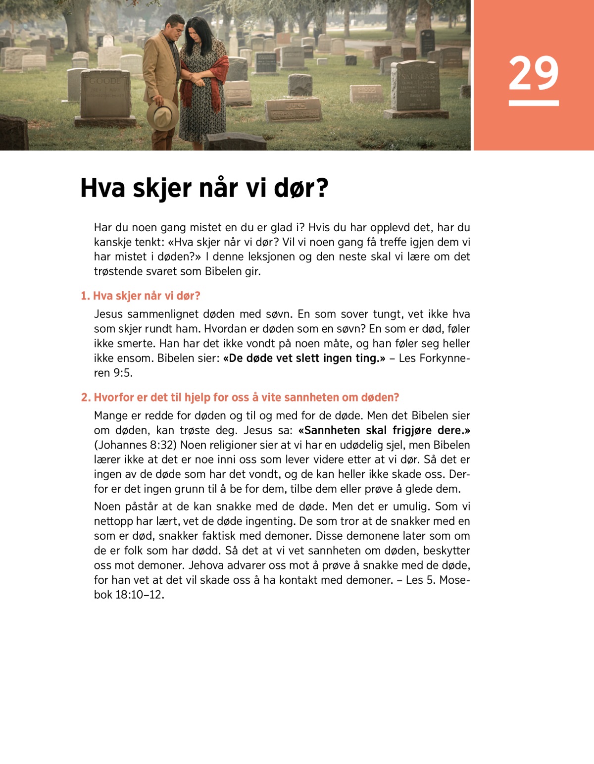 Har du noen gang mistet en du er glad i? Hvis du har opplevd det, har du kanskje tenkt: «Hva skjer når vi dør? Vil vi noen gang få treffe igjen dem vi har mistet i døden?» I denne leksjonen og den neste skal vi lære om det trøstende svaret som Bibelen gir.