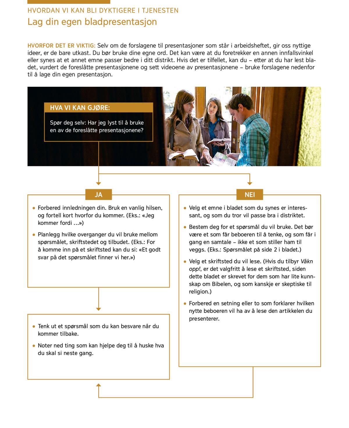 HVORFOR DET ER VIKTIG: Selv om de forslagene til presentasjoner som står i arbeidsheftet, gir oss nyttige ideer, er de bare utkast. Du bør bruke dine egne ord. Det kan være at du foretrekker en annen innfallsvinkel eller synes at et annet emne passer bedre i ditt distrikt. Hvis det er tilfellet, kan du – etter at du har lest bladet, vurdert de foreslåtte presentasjonene og sett videoene av presentasjonene – bruke forslagene nedenfor til å lage din egen presentasjon.