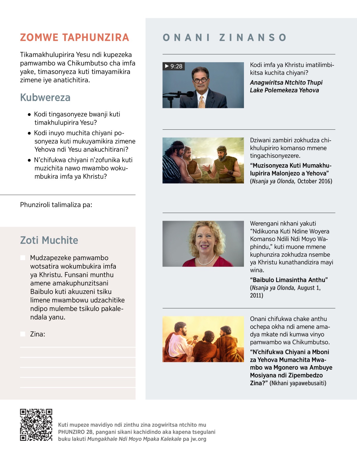 Werengani nkhani yakuti “Ndikuona Kuti Ndine Woyera Komanso Ndili Ndi Moyo Waphindu,” kuti muone mmene kuphunzira zokhudza nsembe ya Khristu kunathandizira mayi wina.