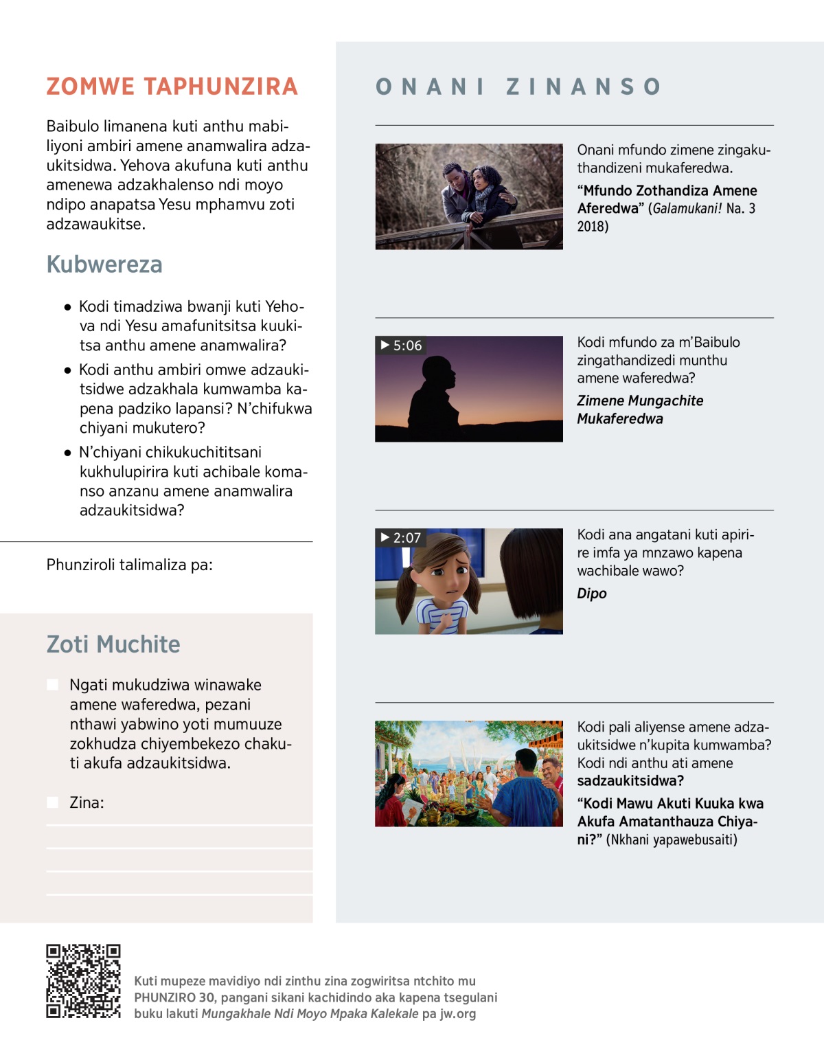 Onani umboni wopezeka m’Baibulo umene ukutsimikizira kuti anthu amene anamwalira adzaukitsidwa. Onaninso mmene kudziwa kuti akufa adzauka kungakutonthozereni komanso kukupatsani chiyembekezo.