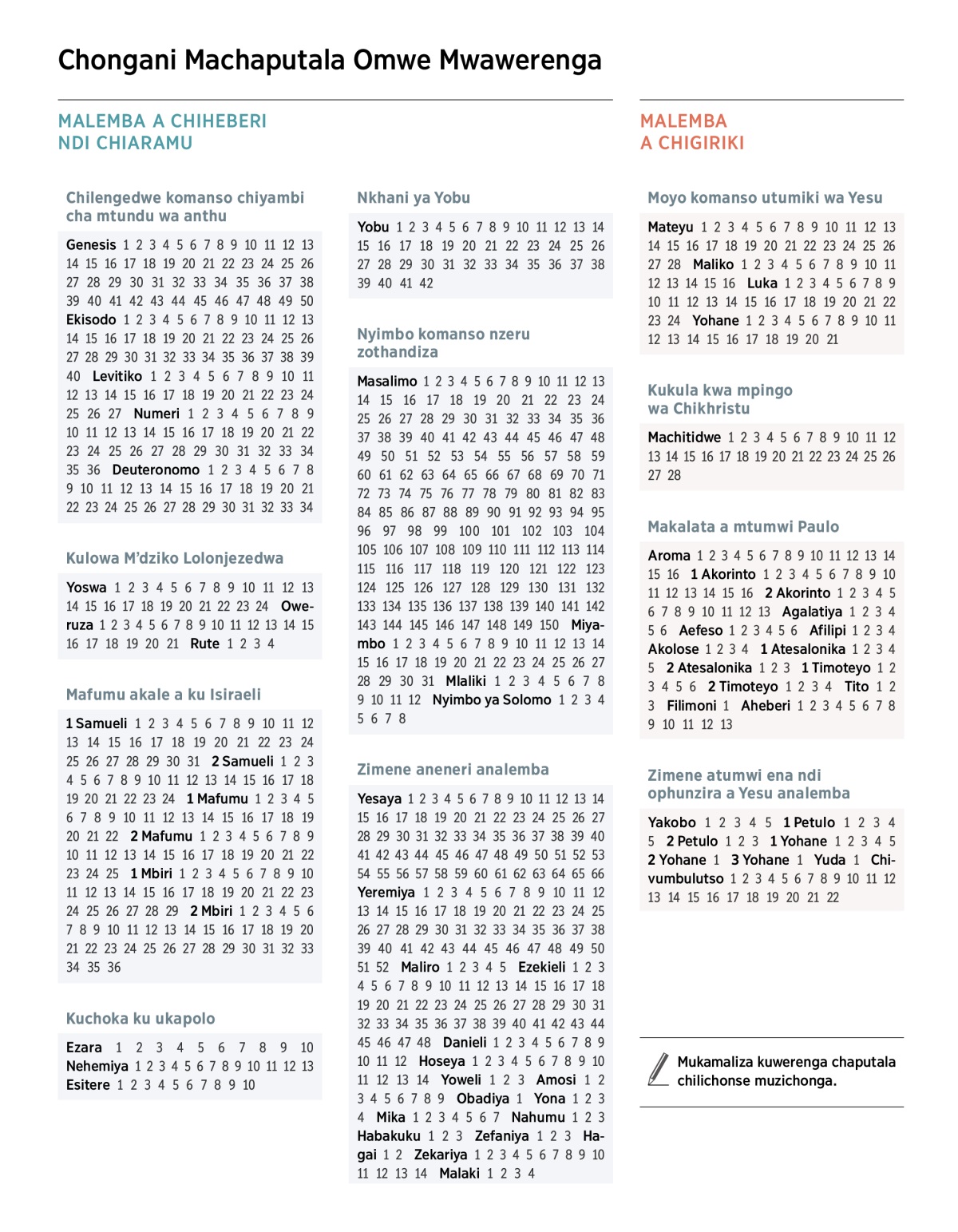 Chongani Machaputala Omwe Mwawerenga Losindikizidwa Chilengedwe komanso chiyambi cha mtundu wa anthu Kulowa M’dziko Lolonjezedwa Mafumu akale a ku Isiraeli Kuchoka ku ukapolo Nkhani ya Yobu Nyimbo komanso nzeru zothandiza Zolemba za aneneri Moyo komanso utumiki wa Yesu Kukula kwa mpingo wa Chikhristu Makalata a mtumwi Paulo Zolemba za atumwi ena ndi ophunzira a Yesu Mukamaliza kuwerenga chaputala chilichonse muzichonga. MALEMBA A CHIHEBERI NDI CHIARAMU Chilengedwe komanso chiyambi cha mtundu wa anthu Genesis 1 2 3 4 5 6 7 8 9 10 11 12 13 14 15 16 17 18 19 20 21 22 23 24 25 26 27 28 29 30 31 32 33 34 35 36 37 38 39 40 41 42 43 44 45 46 47 48 49 50 Ekisodo 1 2 3 4 5 6 7 8 9 10 11 12 13 14 15 16 17 18 19 20 21 22 23 24 25 26 27 28 29 30 31 32 33 34 35 36 37 38 39 40 Levitiko 1 2 3 4 5 6 7 8 9 10 11 12 13 14 15 16 17 18 19 20 21 22 23 24 25 26 27 Numeri 1 2 3 4 5 6 7 8 9 10 11 12 13 14 15 16 17 18 19 20 21 22 23 24 25 26 27 28 29 30 31 32 33 34 35 36 Deuteronomo 1 2 3 4 5 6 7 8 9 10 11 12 13 14 15 16 17 18 19 20 21 22 23 24 25 26 27 28 29 30 31 32 33 34 Kulowa M’dziko Lolonjezedwa Yoswa 1 2 3 4 5 6 7 8 9 10 11 12 13 14 15 16 17 18 19 20 21 22 23 24 Oweruza 1 2 3 4 5 6 7 8 9 10 11 12 13 14 15 16 17 18 19 20 21 Rute 1 2 3 4 Mafumu akale a ku Isiraeli 1 Samueli 1 2 3 4 5 6 7 8 9 10 11 12 13 14 15 16 17 18 19 20 21 22 23 24 25 26 27 28 29 30 31 2 Samueli 1 2 3 4 5 6 7 8 9 10 11 12 13 14 15 16 17 18 19 20 21 22 23 24 1 Mafumu 1 2 3 4 5 6 7 8 9 10 11 12 13 14 15 16 17 18 19 20 21 22 2 Mafumu 1 2 3 4 5 6 7 8 9 10 11 12 13 14 15 16 17 18 19 20 21 22 23 24 25 1 Mbiri 1 2 3 4 5 6 7 8 9 10 11 12 13 14 15 16 17 18 19 20 21 22 23 24 25 26 27 28 29 2 Mbiri 1 2 3 4 5 6 7 8 9 10 11 12 13 14 15 16 17 18 19 20 21 22 23 24 25 26 27 28 29 30 31 32 33 34 35 36 Kuchoka ku ukapolo Ezara 1 2 3 4 5 6 7 8 9 10 Nehemiya 1 2 3 4 5 6 7 8 9 10 11 12 13 Esitere 1 2 3 4 5 6 7 8 9 10 Nkhani ya Yobu Yobu 1 2 3 4 5 6 7 8 9 10 11 12 13 14 15 16 17 18 19 20 21 22 23 24 25 26 27 28 29 30 31 32 33 34 35 36 37 38 39 40 41 42 Nyimbo komanso nzeru zothandiza Masalimo 1 2 3 4 5 6 7 8 9 10 11 12 13 14 15 16 17 18 19 20 21 22 23 24 25 26 27 28 29 30 31 32 33 34 35 36 37 38 39 40 41 42 43 44 45 46 47 48 49 50 51 52 53 54 55 56 57 58 59 60 61 62 63 64 65 66 67 68 69 70 71 72 73 74 75 76 77 78 79 80 81 82 83 84 85 86 87 88 89 90 91 92 93 94 95 96 97 98 99 100 101 102 103 104 105 106 107 108 109 110 111 112 113 114 115 116 117 118 119 120 121 122 123 124 125 126 127 128 129 130 131 132 133 134 135 136 137 138 139 140 141 142 143 144 145 146 147 148 149 150 Miyambo 1 2 3 4 5 6 7 8 9 10 11 12 13 14 15 16 17 18 19 20 21 22 23 24 25 26 27 28 29 30 31 Mlaliki 1 2 3 4 5 6 7 8 9 10 11 12 Nyimbo ya Solomo 1 2 3 4 5 6 7 8 Zimene aneneri analemba Yesaya 1 2 3 4 5 6 7 8 9 10 11 12 13 14 15 16 17 18 19 20 21 22 23 24 25 26 27 28 29 30 31 32 33 34 35 36 37 38 39 40 41 42 43 44 45 46 47 48 49 50 51 52 53 54 55 56 57 58 59 60 61 62 63 64 65 66 Yeremiya 1 2 3 4 5 6 7 8 9 10 11 12 13 14 15 16 17 18 19 20 21 22 23 24 25 26 27 28 29 30 31 32 33 34 35 36 37 38 39 40 41 42 43 44 45 46 47 48 49 50 51 52 Maliro 1 2 3 4 5 Ezekieli 1 2 3 4 5 6 7 8 9 10 11 12 13 14 15 16 17 18 19 20 21 22 23 24 25 26 27 28 29 30 31 32 33 34 35 36 37 38 39 40 41 42 43 44 45 46 47 48 Danieli 1 2 3 4 5 6 7 8 9 10 11 12 Hoseya 1 2 3 4 5 6 7 8 9 10 11 12 13 14 Yoweli 1 2 3 Amosi 1 2 3 4 5 6 7 8 9 Obadiya 1 Yona 1 2 3 4 Mika 1 2 3 4 5 6 7 Nahumu 1 2 3 Habakuku 1 2 3 Zefaniya 1 2 3 Hagai 1 2 Zekariya 1 2 3 4 5 6 7 8 9 10 11 12 13 14 Malaki 1 2 3 4 MALEMBA A CHIGIRIKI Moyo komanso utumiki wa Yesu Mateyu 1 2 3 4 5 6 7 8 9 10 11 12 13 14 15 16 17 18 19 20 21 22 23 24 25 26 27 28 Maliko 1 2 3 4 5 6 7 8 9 10 11 12 13 14 15 16 Luka 1 2 3 4 5 6 7 8 9 10 11 12 13 14 15 16 17 18 19 20 21 22 23 24 Yohane 1 2 3 4 5 6 7 8 9 10 11 12 13 14 15 16 17 18 19 20 21 Kukula kwa mpingo wa Chikhristu Machitidwe 1 2 3 4 5 6 7 8 9 10 11 12 13 14 15 16 17 18 19 20 21 22 23 24 25 26 27 28 Makalata a mtumwi Paulo Aroma 1 2 3 4 5 6 7 8 9 10 11 12 13 14 15 16 1 Akorinto 1 2 3 4 5 6 7 8 9 10 11 12 13 14 15 16 2 Akorinto 1 2 3 4 5 6 7 8 9 10 11 12 13 Agalatiya 1 2 3 4 5 6 Aefeso 1 2 3 4 5 6 Afilipi 1 2 3 4 Akolose 1 2 3 4 1 Atesalonika 1 2 3 4 5 2 Atesalonika 1 2 3 1 Timoteyo 1 2 3 4 5 6 2 Timoteyo 1 2 3 4 Tito 1 2 3 Filimoni 1 Aheberi 1 2 3 4 5 6 7 8 9 10 11 12 13 Zimene atumwi ena ndi ophunzira a Yesu analemba Yakobo 1 2 3 4 5 1 Petulo 1 2 3 4 5 2 Petulo 1 2 3 1 Yohane 1 2 3 4 5 2 Yohane 1 3 Yohane 1 Yuda 1 Chivumbulutso 1 2 3 4 5 6 7 8 9 10 11 12 13 14 15 16 17 18 19 20 21 22