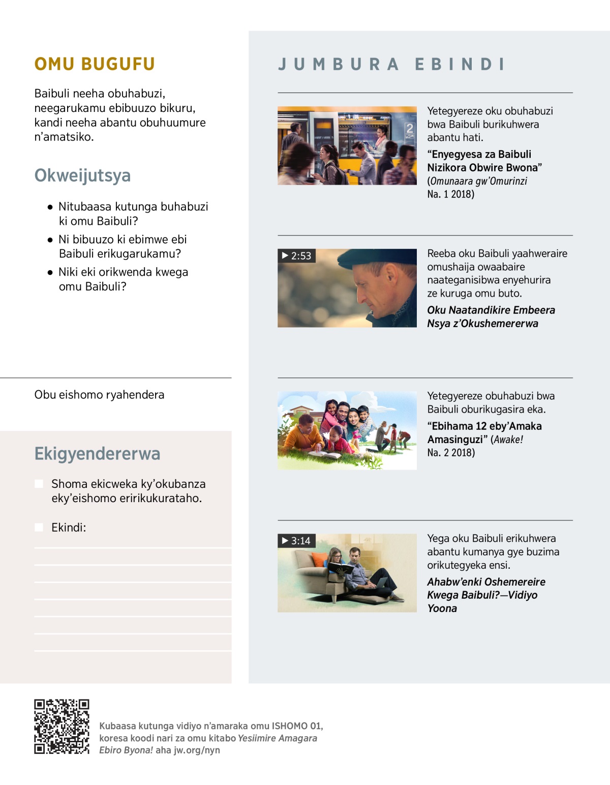 Abantu baingi nibakunda kushoma Baibuli kandi nibagigasirwamu. Zaana VIDIYO, kubaasa kugarukamu ebibuuzo ebirikukurataho.