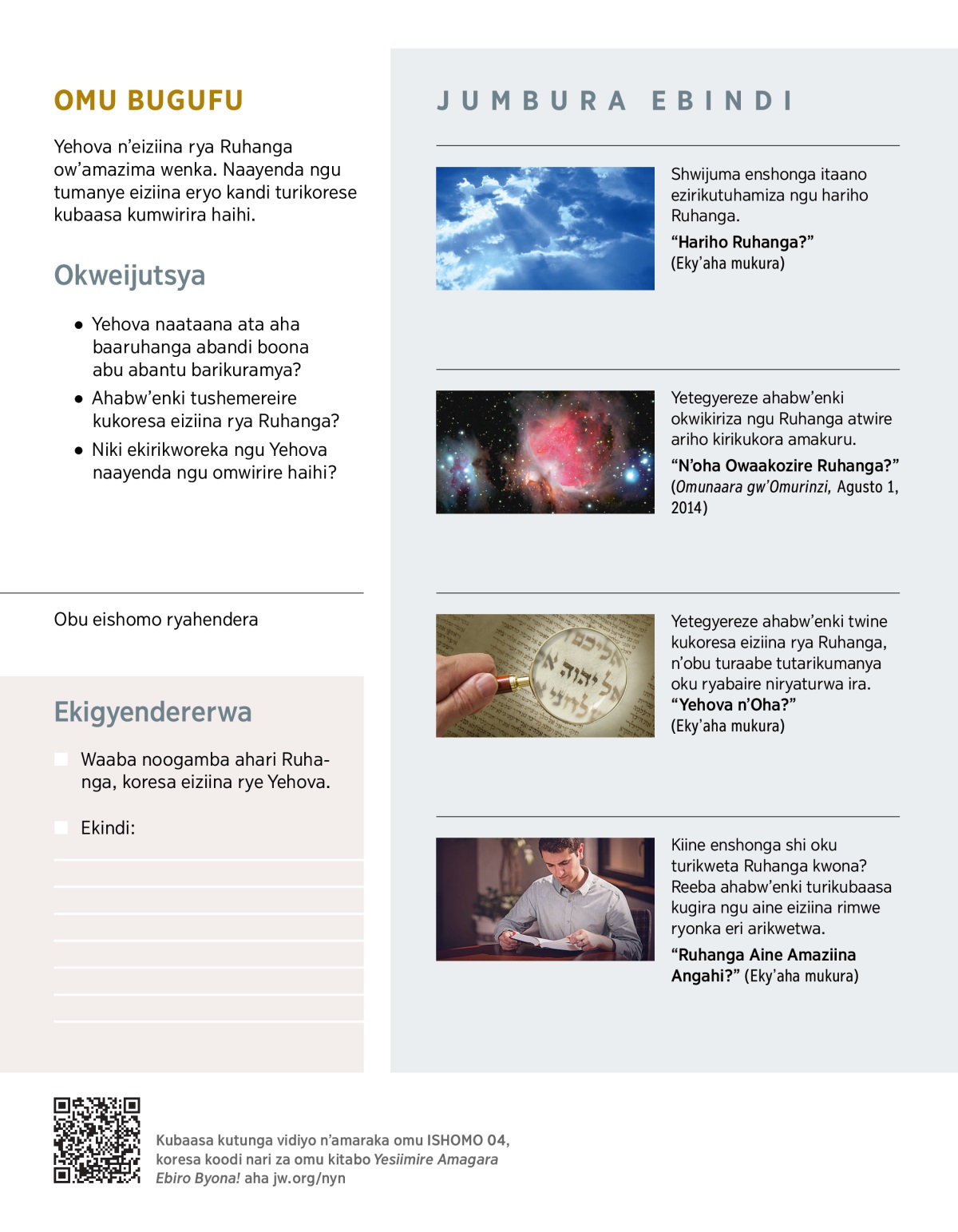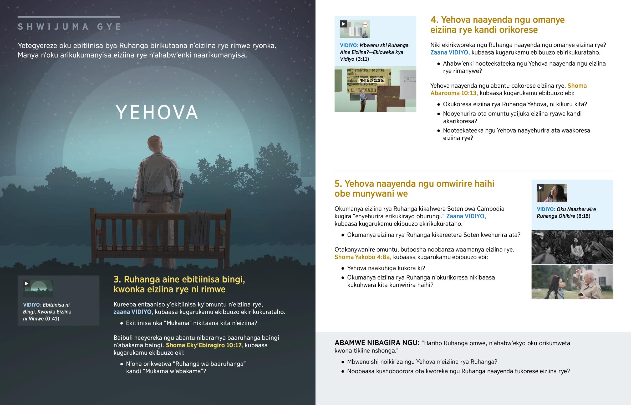 Yehova naayenda ngu abantu bakorese eiziina rye. Shoma Abarooma 10:13, kubaasa kugarukamu ebibuuzo ebi: