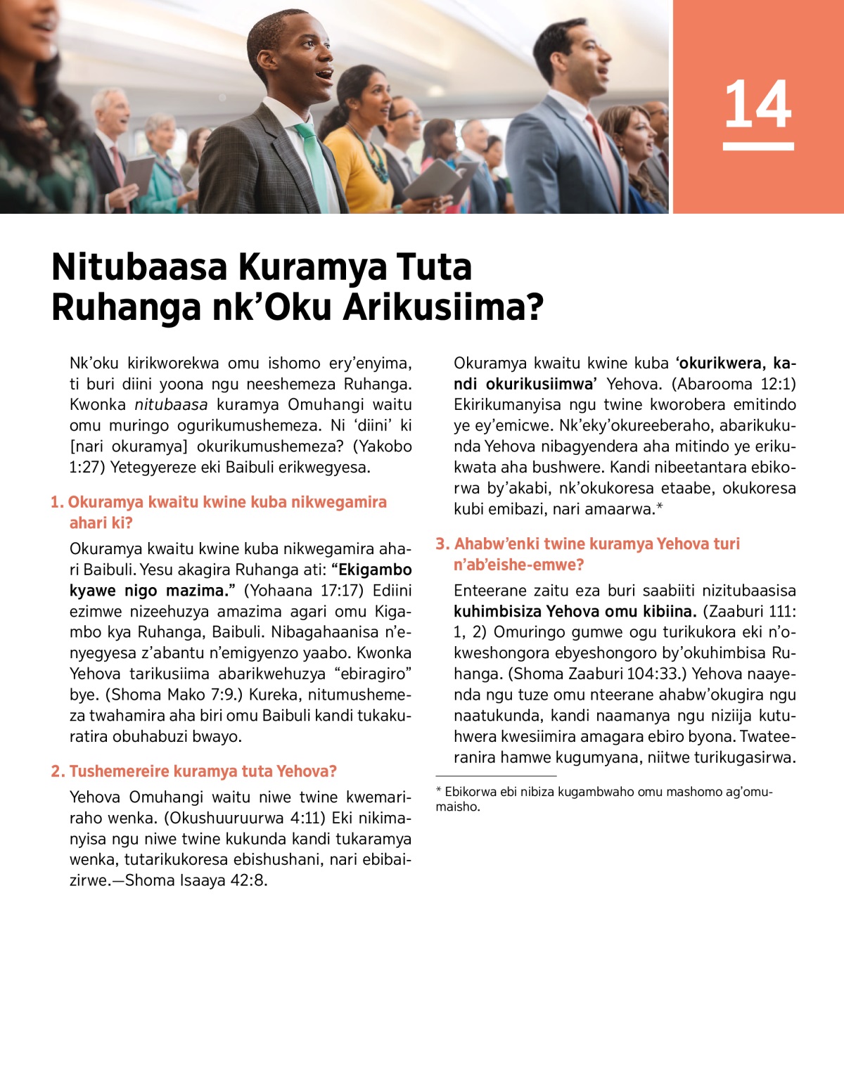 Enteerane zaitu eza buri saabiiti nizitubaasisa kuhimbisiza Yehova omu kibiina. (Zaaburi 111:1, 2) Omuringo gumwe ogu turikukora eki n’okweshongora ebyeshongoro by’okuhimbisa Ruhanga. (Shoma Zaaburi 104:33.) Yehova naayenda ngu tuze omu nteerane ahabw’okugira ngu naatukunda, kandi naamanya ngu niziija kutuhwera kwesiimira amagara ebiro byona. Twateeranira hamwe kugumyana, niitwe turikugasirwa.