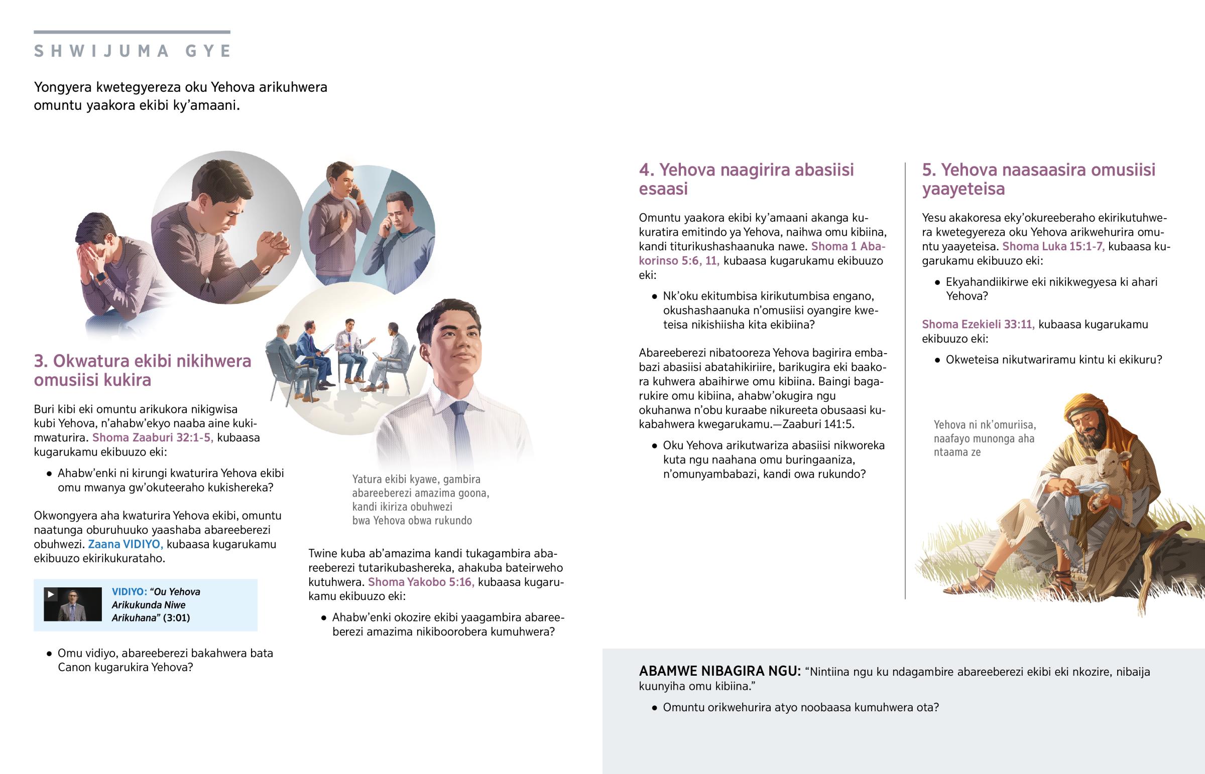 Yehova naagira ngu omuntu yaakora ekibi ky’amaani, aine kweta abareeberezi b’ekibiina. (Shoma Yakobo 5:14, 15.) Abashaija aba abatoorainwe nibakunda Yehova n’entaama ze. Baine byona ebirikwetengyesa kuhwera omuntu kugaruraho omukago gwe na Yehova.—Abagalatia 6:1.