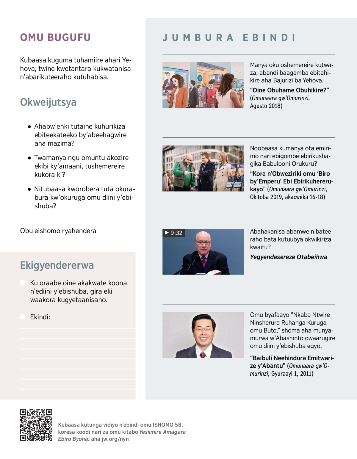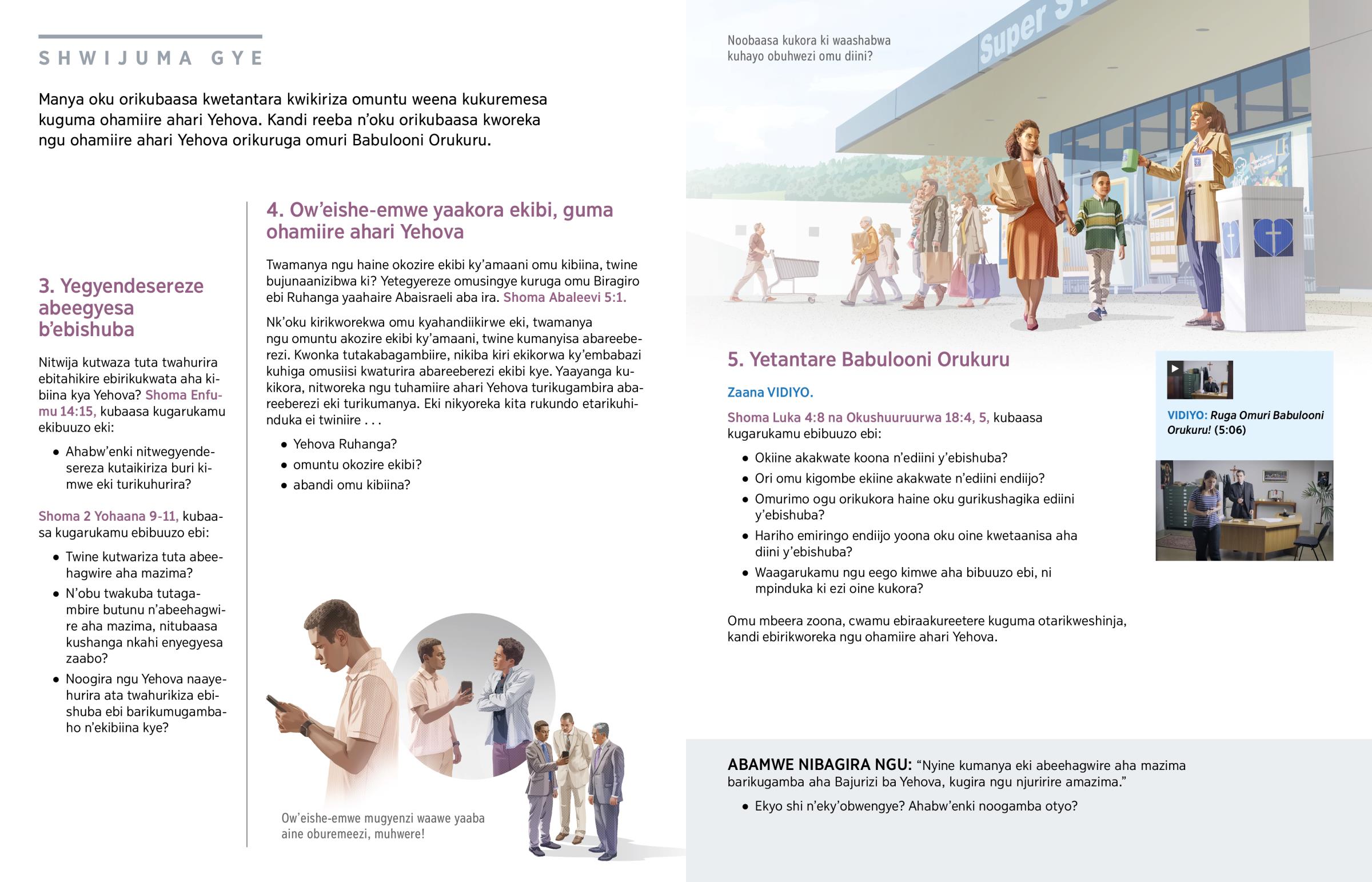 Rukundo ei twiniire Yehova neija kutuhiga kwetantara ekintu kyona ekiine akakwate n’ediini y’ebishuba. Yaaba emirimo yaitu, nari ebigombe ebi turimu, nari ekintu kyona eki turikwejumbamu, tihaine ekishemereire kuba kiine akakwate n’ediini y’ebishuba. Yehova naaturabura ati: ‘Murugye [omuri Babulooni Orurembo Orukuru] imwe bantu bangye ‘mwe.’—Okushuuruurwa 18:2, 4.