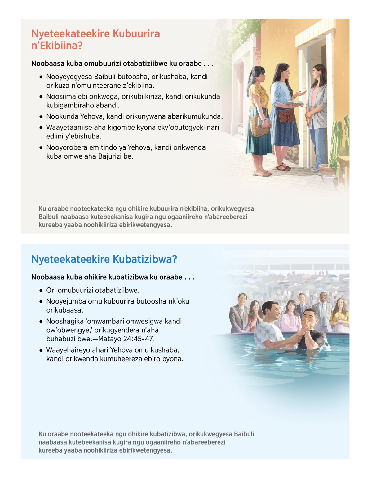 Ku oraabe nooteekateeka ngu ohikire kubatizibwa, orikukwegyesa Baibuli naabaasa kutebeekanisa kugira ngu ogaaniireho n’abareeberezi kureeba yaaba noohikiiriza ebirikwetengyesa.