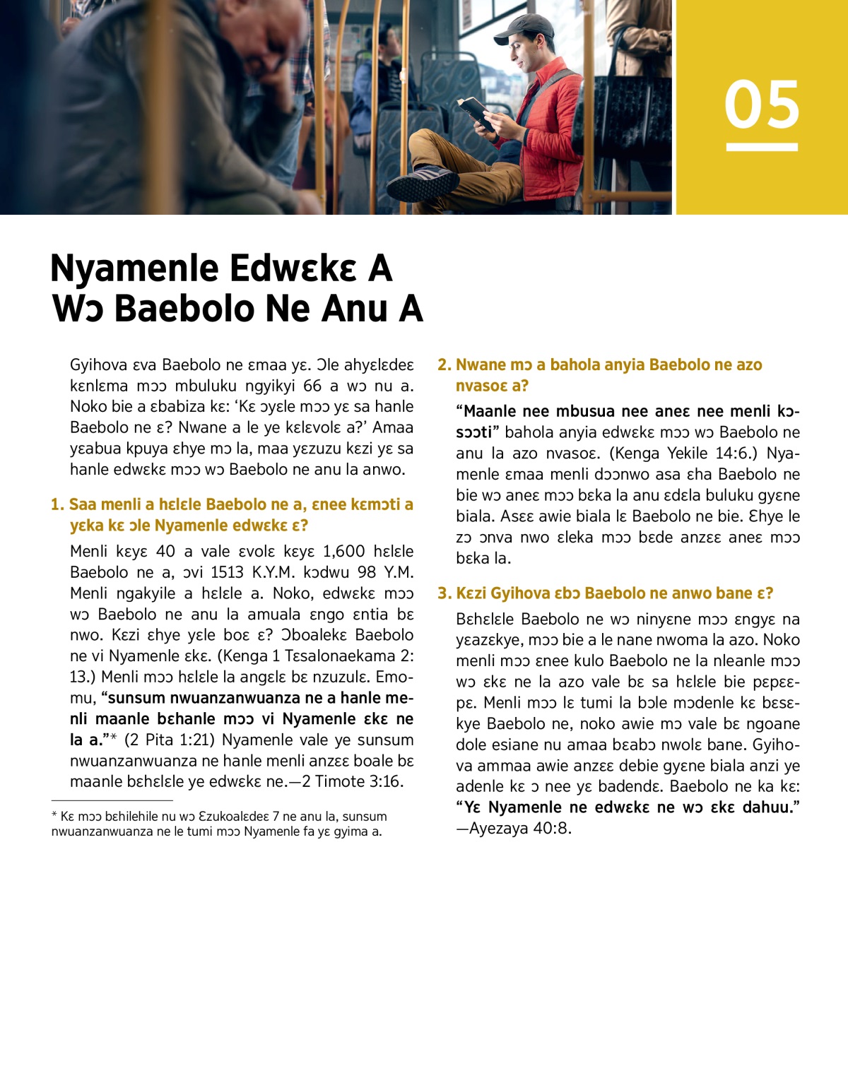 Gyihova ɛva Baebolo ne ɛmaa yɛ. Ɔle ahyɛlɛdeɛ kɛnlɛma mɔɔ mbuluku ngyikyi 66 a wɔ nu a. Noko bie a ɛbabiza kɛ: ‘Kɛ ɔyɛle mɔɔ yɛ sa hanle Baebolo ne ɛ? Nwane a le ye kɛlɛvolɛ a?’ Amaa yɛabua kpuya ɛhye mɔ la, maa yɛzuzu kɛzi yɛ sa hanle edwɛkɛ mɔɔ wɔ Baebolo ne anu la anwo.
