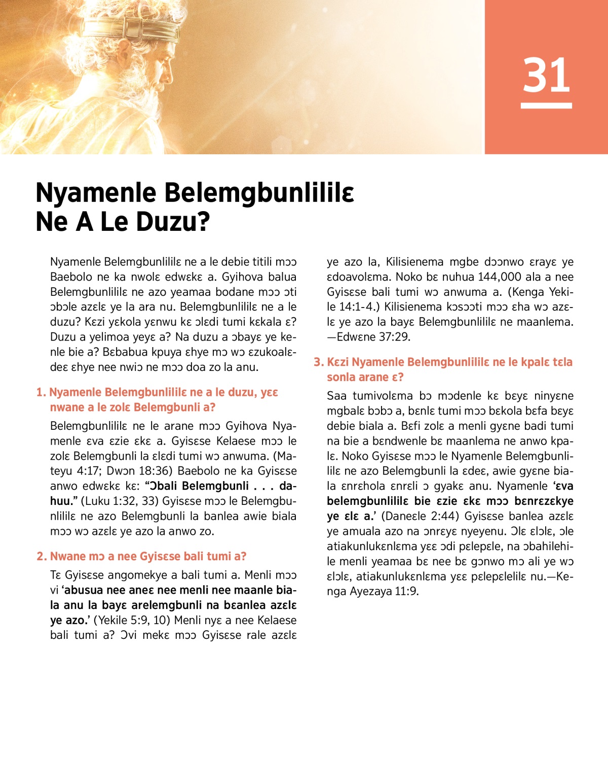 Nyamenle Belemgbunlililɛ ne a le debie titili mɔɔ Baebolo ne ka nwolɛ edwɛkɛ a. Gyihova balua Belemgbunlililɛ ne azo yeamaa bodane mɔɔ ɔti ɔbɔle azɛlɛ ye la ara nu. Belemgbunlililɛ ne a le duzu? Kɛzi yɛkola yɛnwu kɛ ɔlɛdi tumi kɛkala ɛ? Duzu a yelimoa yeyɛ a? Na duzu a ɔbayɛ ye kenle bie a? Bɛbabua kpuya ɛhye mɔ wɔ ɛzukoalɛdeɛ ɛhye nee nwiɔ ne mɔɔ doa zo la anu.