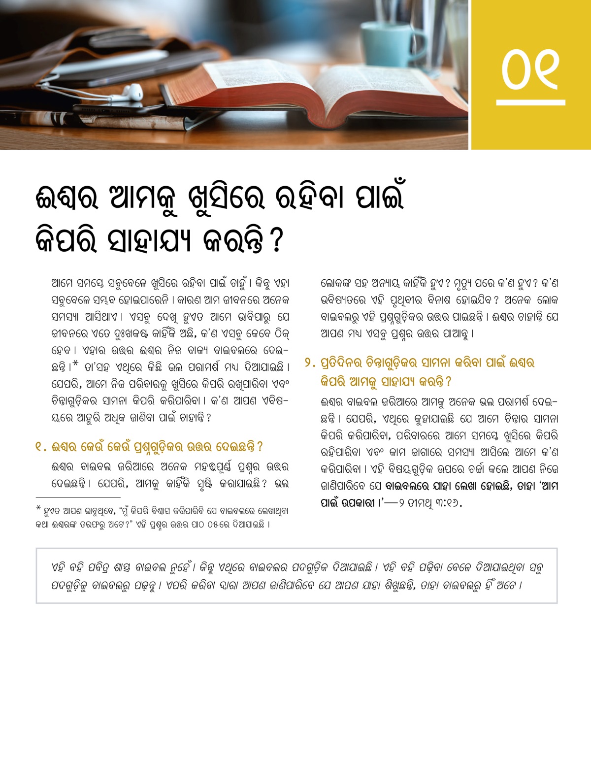 ଈଶ୍ୱର ବାଇବଲ ଜରିଆରେ ଅନେକ ମହତ୍ତ୍ୱପୂର୍ଣ୍ଣ ପ୍ରଶ୍ନର ଉତ୍ତର ଦେଇଛନ୍ତି । ଯେପରି, ଆମକୁ କାହିଁକି ସୃଷ୍ଟି କରାଯାଇଛି ? ଭଲ ଲୋକଙ୍କ ସହ ଅନ୍ୟାୟ କାହିଁକି ହୁଏ ? ମୃତ୍ୟୁ ପରେ କʼଣ ହୁଏ ? କʼଣ ଭବିଷ୍ୟତରେ ଏହି ପୃଥିବୀର ବିନାଶ ହୋଇଯିବ ? ଅନେକ ଲୋକ ବାଇବଲରୁ ଏହି ପ୍ରଶ୍ନଗୁଡ଼ିକର ଉତ୍ତର ପାଇଛନ୍ତି । ଈଶ୍ୱର ଚାହାନ୍ତି ଯେ ଆପଣ ମଧ୍ୟ ଏସବୁ ପ୍ରଶ୍ନର ଉତ୍ତର ପାଆନ୍ତୁ ।