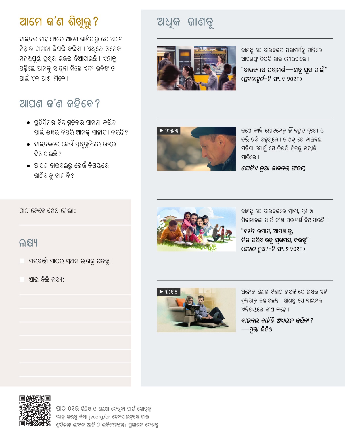 ଆମେ ସମସ୍ତେ ସବୁବେଳେ ଖୁସିରେ ରହିବା ପାଇଁ ଚାହୁଁ । କିନ୍ତୁ ଏହା ସବୁବେଳେ ସମ୍ଭବ ହୋଇପାରେନି । କାରଣ ଆମ ଜୀବନରେ ଅନେକ ସମସ୍ୟା ଆସିଥାଏ । ଏସବୁ ଦେଖି ହୁଏତ ଆମେ ଭାବିପାରୁ ଯେ ଜୀବନରେ ଏତେ ଦୁଃଖକଷ୍ଟ କାହିଁକି ଅଛି, କʼଣ ଏସବୁ କେବେ ଠିକ୍ ହେବ । ଏହାର ଉତ୍ତର ଈଶ୍ୱର ନିଜ ବାକ୍ୟ ବାଇବଲରେ ଦେଇଛନ୍ତି ।a ତାʼସହ ଏଥିରେ କିଛି ଭଲ ପରାମର୍ଶ ମଧ୍ୟ ଦିଆଯାଇଛି । ଯେପରି, ଆମେ ନିଜ ପରିବାରକୁ ଖୁସିରେ କିପରି ରଖିପାରିବା ଏବଂ ଚିନ୍ତାଗୁଡ଼ିକର ସାମନା କିପରି କରିପାରିବା । କʼଣ ଆପଣ ଏବିଷୟରେ ଆହୁରି ଅଧିକ ଜାଣିବା ପାଇଁ ଚାହାନ୍ତି ?