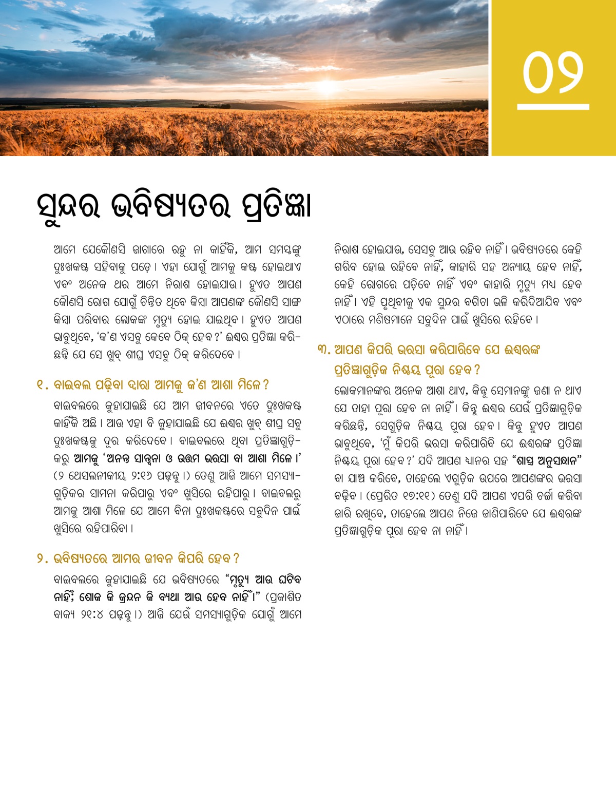 ବାଇବଲରେ ପ୍ରତିଜ୍ଞା କରାଯାଇଛି ଯେ ଆମ ଭବିଷ୍ୟତ ଭଲ ହେବ । ଏଥିରୁ ଆମକୁ ଆଶା ମିଳେ ଏବଂ ସମସ୍ୟା ସତ୍ତ୍ୱେ ଆମେ ଖୁସିରେ ରହୁ ।