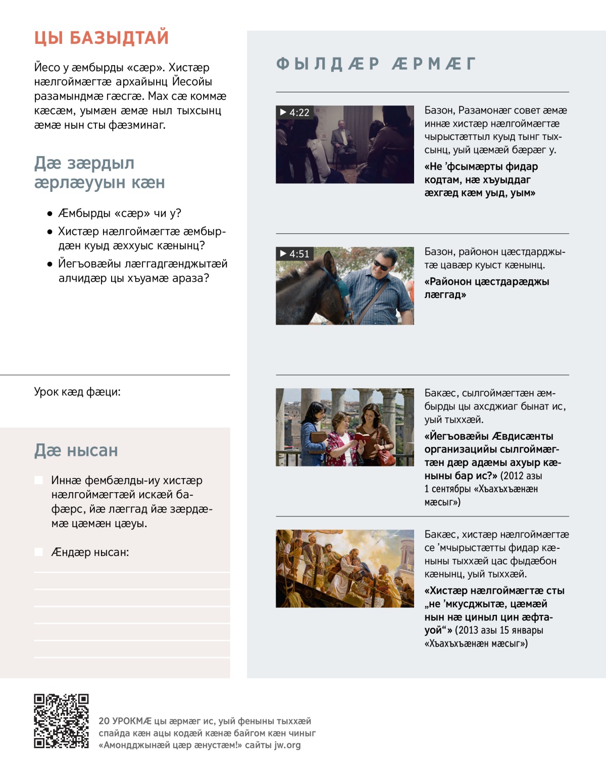 Базон, Йесо цавӕр Разамонӕг у ӕмӕ хистӕр нӕлгоймӕгтӕ Йесойы куыд фӕзмынц, уый. Стӕй ма базон, нӕ бон куыд у Йесойы коммӕ кӕсын ӕмӕ хистӕр нӕлгоймӕгтӕн ӕххуыс кӕнын.