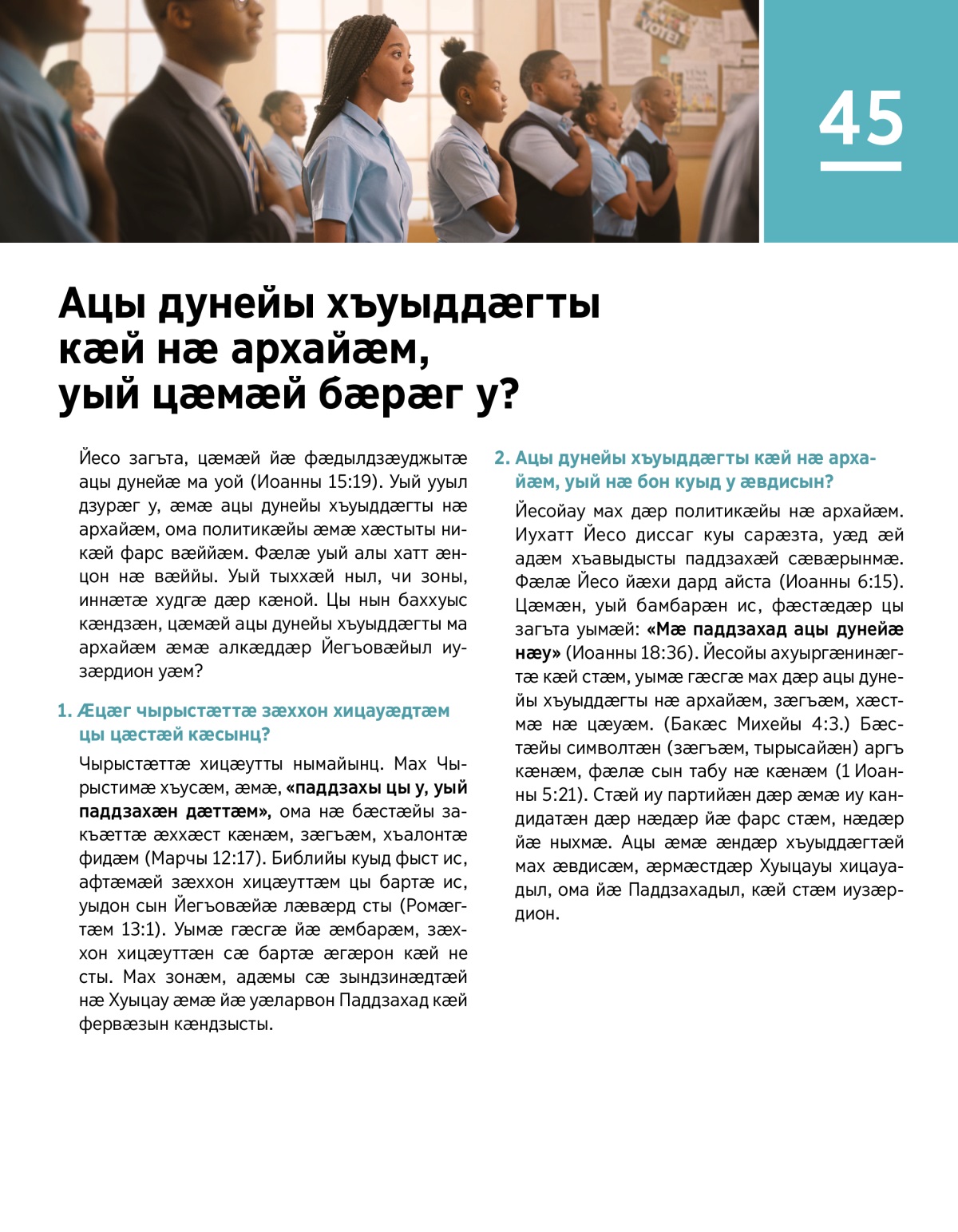 Йесо загъта, цӕмӕй йӕ фӕдылдзӕуджытӕ ацы дунейӕ ма уой (Иоанны 15:19). Уый ууыл дзурӕг у, ӕмӕ ацы дунейы хъуыддӕгты нӕ архайӕм, ома политикӕйы ӕмӕ хӕстыты никӕй фарс вӕййӕм. Фӕлӕ уый алы хатт ӕнцон нӕ вӕййы. Уый тыххӕй ныл, чи зоны, иннӕтӕ худгӕ дӕр кӕной. Цы нын баххуыс кӕндзӕн, цӕмӕй ацы дунейы хъуыддӕгты ма архайӕм ӕмӕ алкӕддӕр Йегъовӕйыл иузӕрдион уӕм?