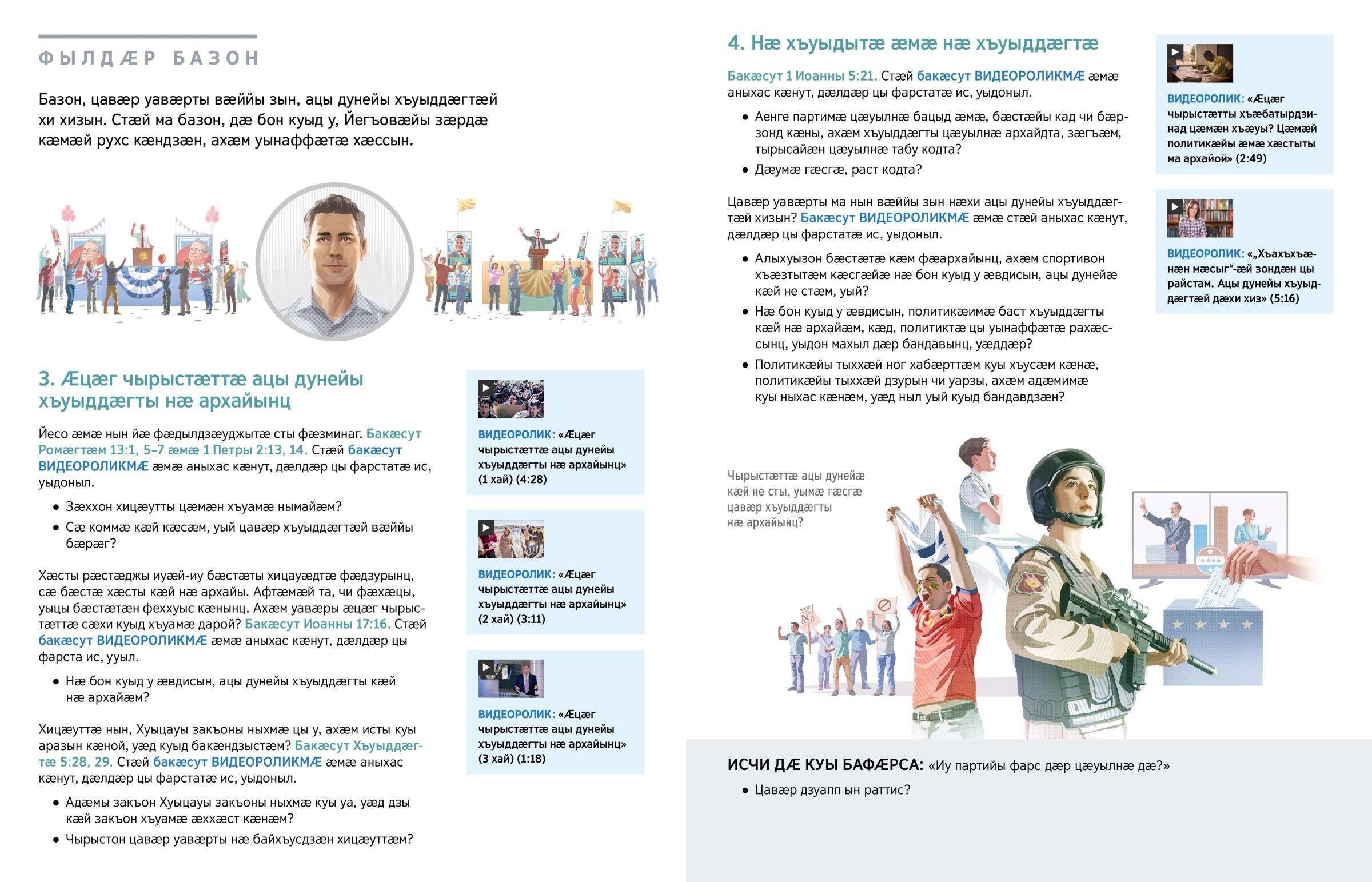 Хӕсты рӕстӕджы иуӕй-иу бӕстӕты хицауӕдтӕ фӕдзурынц, сӕ бӕстӕ хӕсты кӕй нӕ архайы. Афтӕмӕй та, чи фӕхӕцы, уыцы бӕстӕтӕн феххуыс кӕнынц. Ахӕм уавӕры ӕцӕг чырыстӕттӕ сӕхи куыд хъуамӕ дарой? Бакӕсут Иоанны 17:16. Стӕй бакӕсут ВИДЕОРОЛИКМӔ ӕмӕ аныхас кӕнут, дӕлдӕр цы фарста ис, ууыл.