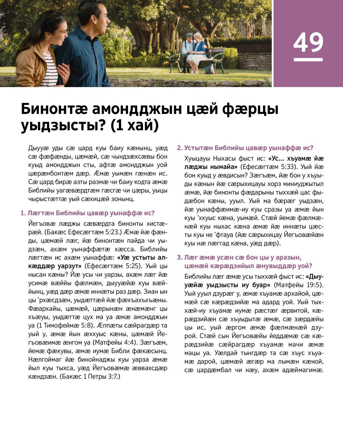 Дыууӕ уды сӕ цард куы баиу кӕнынц, уӕд сӕ фӕфӕнды, цӕмӕй, сӕ чындзӕхсӕвы бон куыд амондджын сты, афтӕ амондджын уой цӕрӕнбонтӕм дӕр. Ӕмӕ уымӕн гӕнӕн ис. Сӕ цард бирӕ азты размӕ чи баиу кодта ӕмӕ Библийы уагӕвӕрдтӕм гӕсгӕ чи цӕры, уыцы чырыстӕттӕ уый сӕхицӕй зонынц.