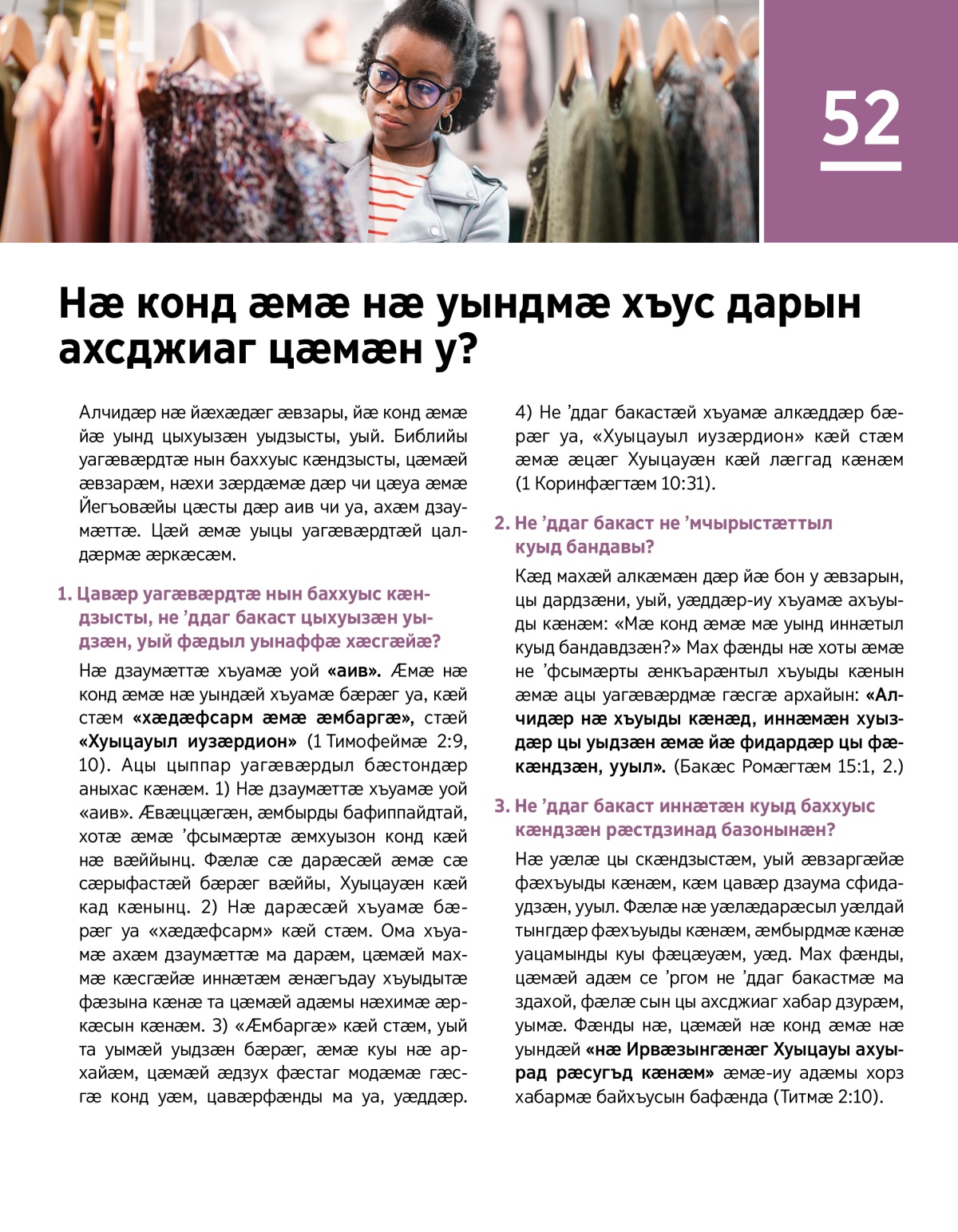 Бакӕсут 1 Коринфӕгтӕм 10:32, 33 ӕмӕ 1 Иоанны 2:15, 16 ӕмӕ стӕй аныхас кӕнут ацы фарстатыл: