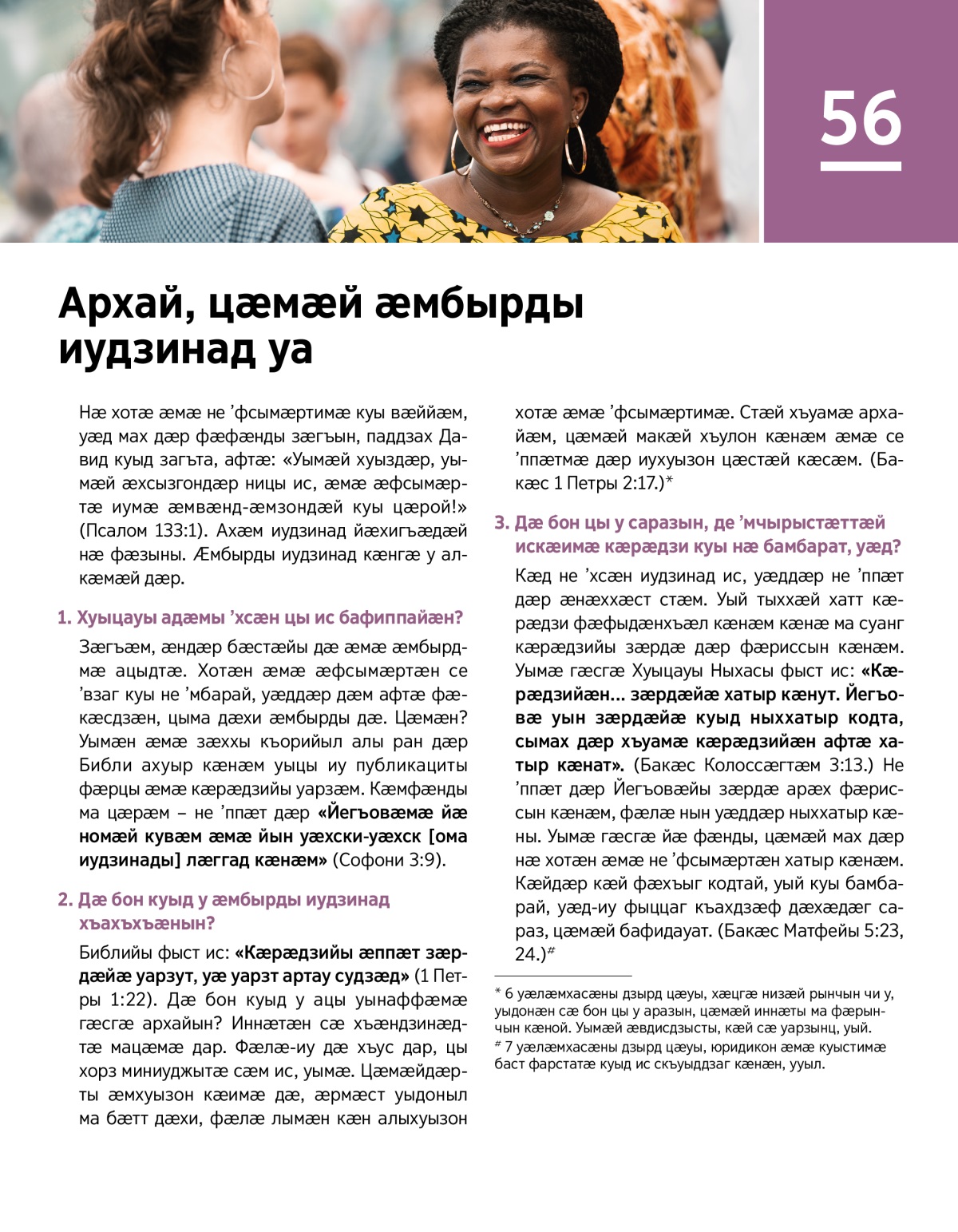 Библийы фыст ис: «Кӕрӕдзийы ӕппӕт зӕрдӕйӕ уарзут, уӕ уарзт артау судзӕд» (1 Петры 1:22). Дӕ бон куыд у ацы уынаффӕмӕ гӕсгӕ архайын? Иннӕтӕн сӕ хъӕндзинӕдтӕ мацӕмӕ дар. Фӕлӕ-иу дӕ хъус дар, цы хорз миниуджытӕ сӕм ис, уымӕ. Цӕмӕйдӕрты ӕмхуызон кӕимӕ дӕ, ӕрмӕст уыдоныл ма бӕтт дӕхи, фӕлӕ лымӕн кӕн алыхуызон хотӕ ӕмӕ ’фсымӕртимӕ. Стӕй хъуамӕ архайӕм, цӕмӕй макӕй хъулон кӕнӕм ӕмӕ се ’ппӕтмӕ дӕр иухуызон цӕстӕй кӕсӕм. (Бакӕс 1 Петры 2:17.)a