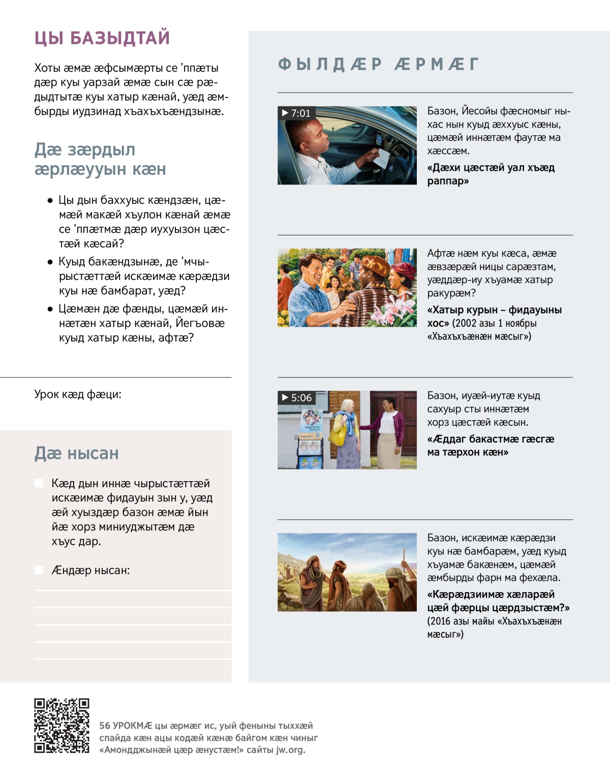 Зӕгъӕм, ӕндӕр бӕстӕйы дӕ ӕмӕ ӕмбырдмӕ ацыдтӕ. Хотӕн ӕмӕ ӕфсымӕртӕн се ’взаг куы не ’мбарай, уӕддӕр дӕм афтӕ фӕкӕсдзӕн, цыма дӕхи ӕмбырды дӕ. Цӕмӕн? Уымӕн ӕмӕ зӕххы къорийыл алы ран дӕр Библи ахуыр кӕнӕм уыцы иу публикациты фӕрцы ӕмӕ кӕрӕдзийы уарзӕм. Кӕмфӕнды ма цӕрӕм – не ’ппӕт дӕр «Йегъовӕмӕ йӕ номӕй кувӕм ӕмӕ йын уӕхски-уӕхск [ома иудзинады] лӕггад кӕнӕм» (Софони 3:9).