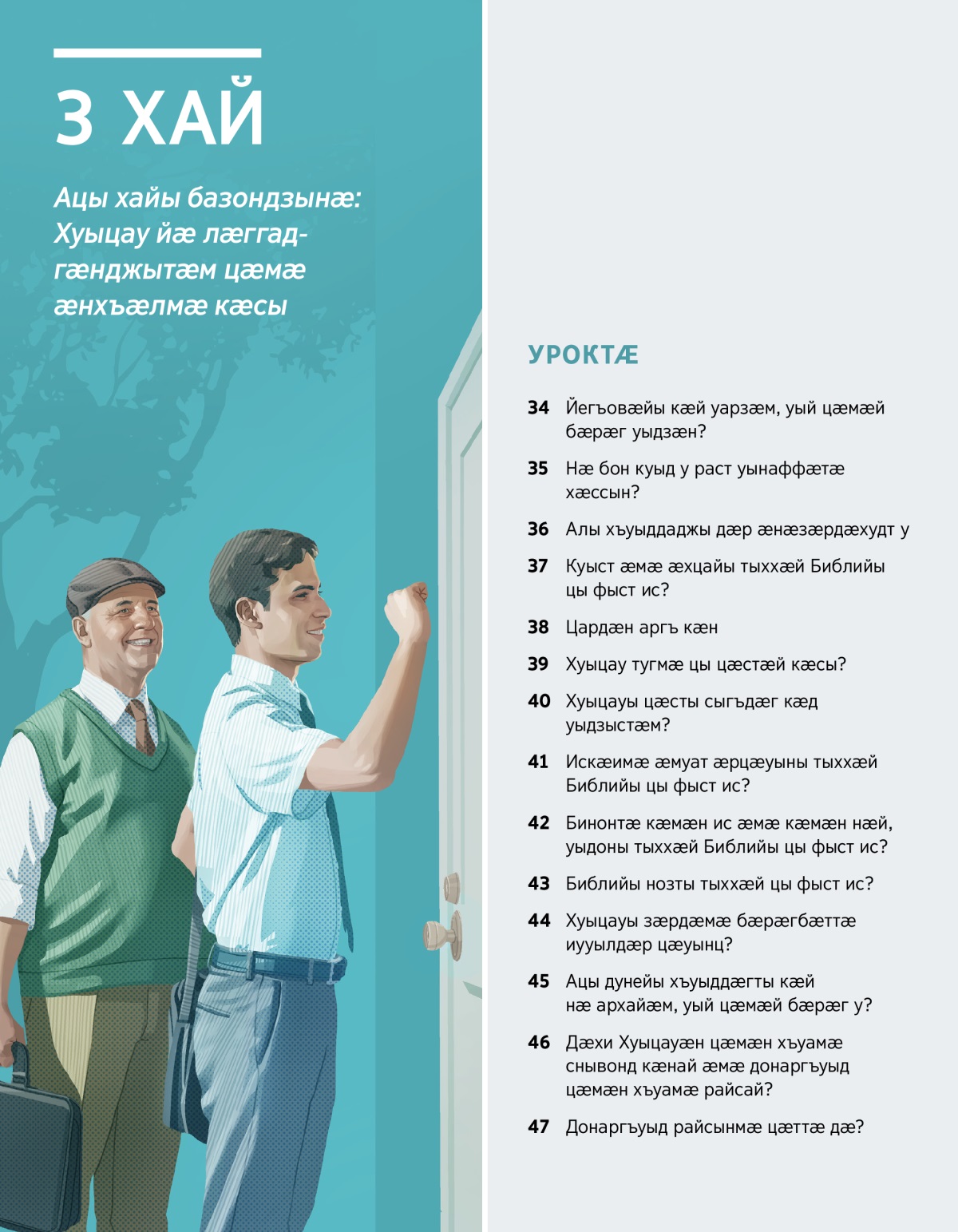 3 хай Мыхуыргонд публикаци Ацы хайы базондзынӕ: Хуыцау йӕ лӕггадгӕнджытӕм цӕмӕ ӕнхъӕлмӕ кӕсы УРОКТӔ 34 Йегъовӕйы кӕй уарзӕм, уый цӕмӕй бӕрӕг уыдзӕн? 35 Нӕ бон куыд у раст уынаффӕтӕ хӕссын? 36 Алы хъуыддаджы дӕр ӕнӕзӕрдӕхудт у 37 Куыст ӕмӕ ӕхцайы тыххӕй Библийы цы фыст ис? 38 Цардӕн аргъ кӕн 39 Хуыцау тугмӕ цы цӕстӕй кӕсы? 40 Хуыцауы цӕсты сыгъдӕг кӕд уыдзыстӕм? 41 Искӕимӕ ӕмуат ӕрцӕуыны тыххӕй Библийы цы фыст ис? 42 Бинонтӕ кӕмӕн ис ӕмӕ кӕмӕн нӕй, уыдоны тыххӕй Библийы цы фыст ис? 43 Библийы нозты тыххӕй цы фыст ис? 44 Хуыцауы зӕрдӕмӕ бӕрӕгбӕттӕ иууылдӕр цӕуынц? 45 Ацы дунейы хъуыддӕгты кӕй нӕ архайӕм, уый цӕмӕй бӕрӕг у? 46 Дӕхи Хуыцауӕн цӕмӕн хъуамӕ снывонд кӕнай ӕмӕ донаргъуыд цӕмӕн хъуамӕ райсай? 47 Донаргъуыд райсынмӕ цӕттӕ дӕ?