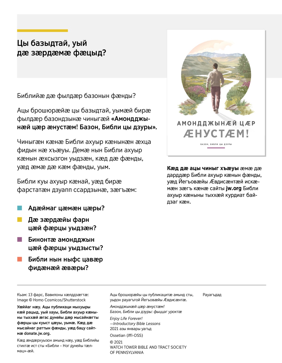 Ацы брошюрӕйӕ цы базыдтай, уымӕй бирӕ фылдӕр базондзынӕ чиныгӕй «Амондджынӕй цӕр ӕнустӕм! Базон, Библи цы дзуры».