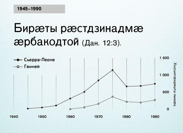 Кӕй зӕгъын ӕй хъӕуы, уый бынӕттон хъусынгӕнджыты мӕты ӕфтыдта. Фӕлӕ сӕ къухтӕ не ’руагътой. 1947–1952 азты хъусынгӕнджыты нымӕц фӕфылдӕр, 38 адӕймагӕй систы 73. Фритауны цур горӕт Ватерлоойы зынгзӕрдӕ пионерты фыдӕбоны фӕрцы фӕзынд ног ӕмбырд. Библи чи ахуыр кодта, ахӕм ног къордтӕ фӕзынд Фритауны цур горӕттӕ Кисси ӕмӕ Веллингтоны. Куыд зынди, афтӕмӕй Сьерра-Леонейы нырма бирӕ адӕм базыдтаиккой рӕстдзинад. Уымӕн цы баххуыс кодтаид?
