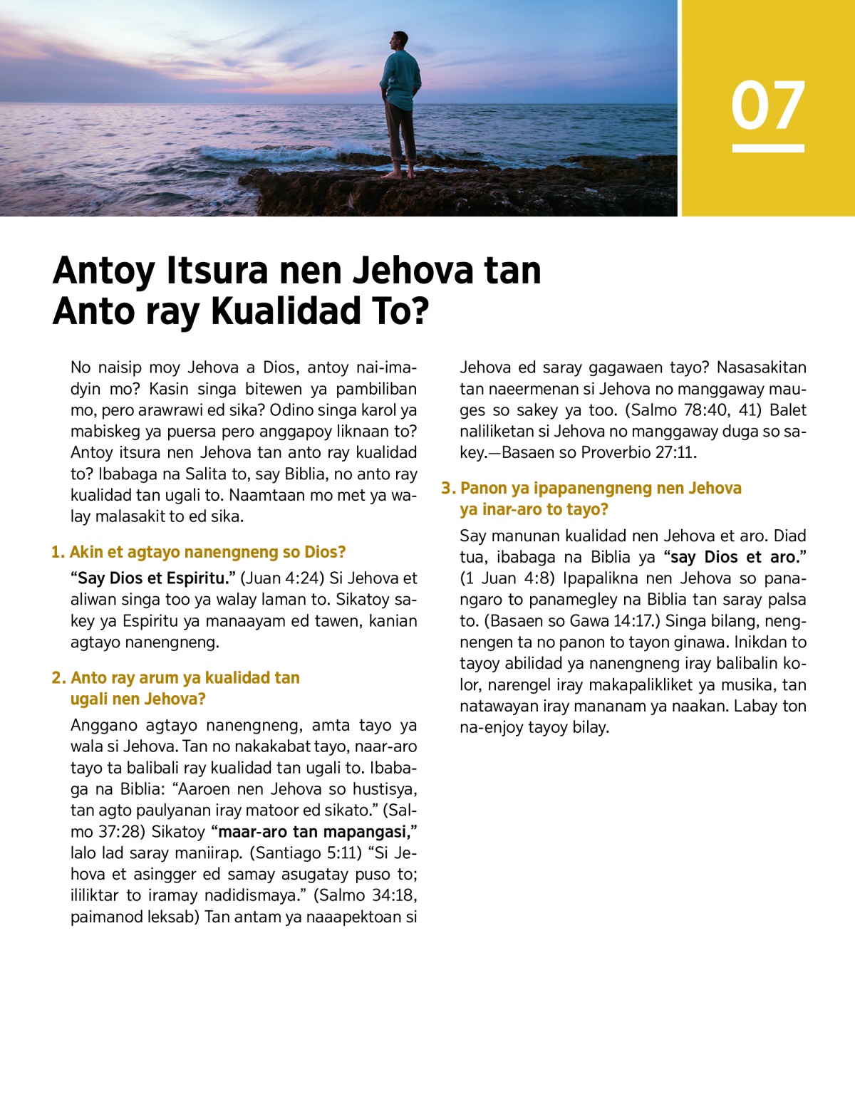No naisip moy Jehova a Dios, antoy nai-imadyin mo? Kasin singa bitewen ya pambiliban mo, pero arawrawi ed sika? Odino singa karol ya mabiskeg ya puersa pero anggapoy liknaan to? Antoy itsura nen Jehova tan anto ray kualidad to? Ibabaga na Salita to, say Biblia, no anto ray kualidad tan ugali to. Naamtaan mo met ya walay malasakit to ed sika.