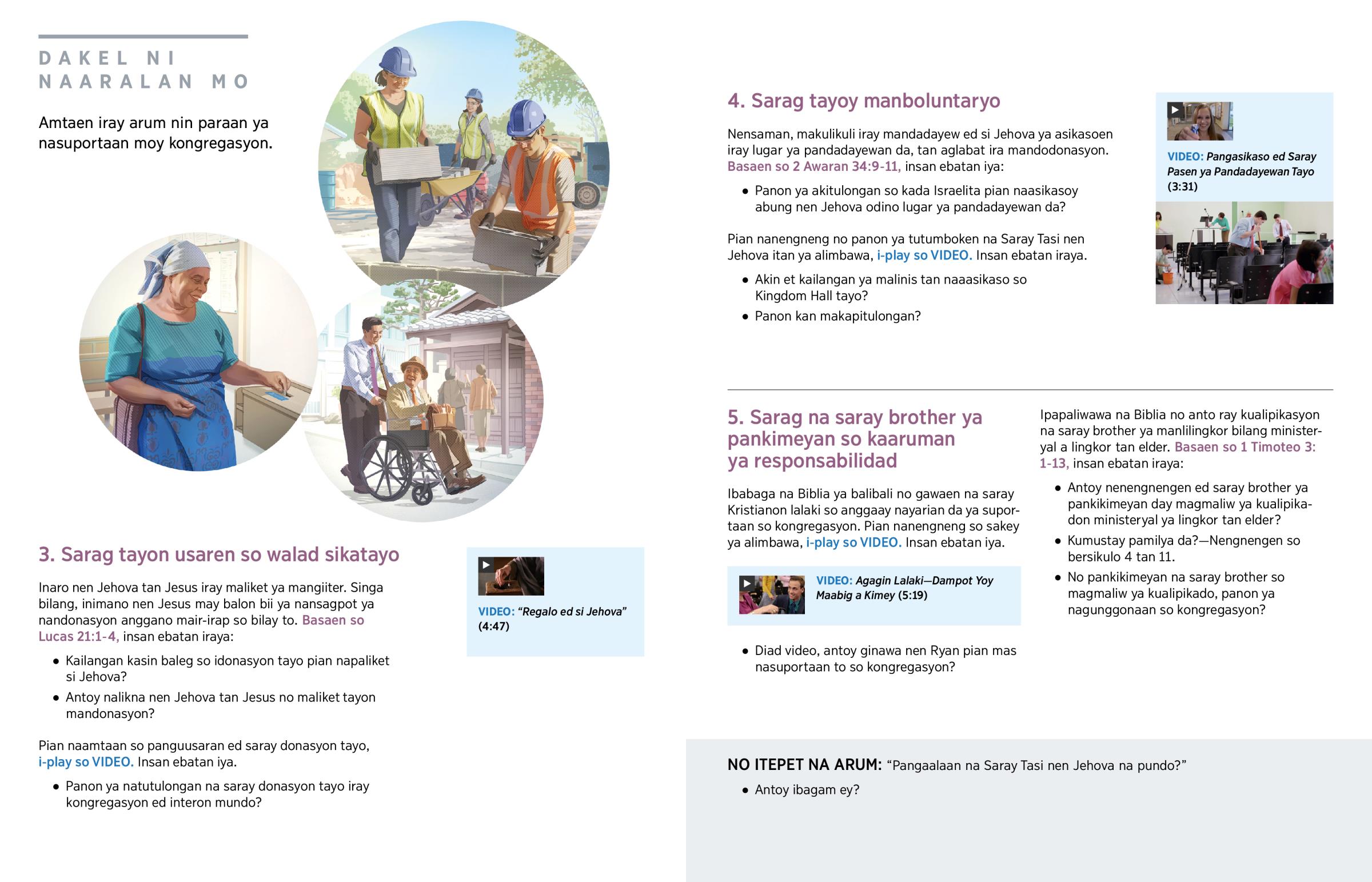 Walay nitulong tayon amin ed kongregasyon. Singa bilang, wala ray kakongregasyon yo ya maedad la odino walay kapansanan to? Ompan sarag yo ran abeten pian makapiaral ira, itindaanan o ilinisan na abung. (Basaen so Santiago 1:27.) Sarag tayo met so manboluntaryon manlinis tan manmintina na Kingdom Hall tayo. Anggapoy mamipilit ed sikatayon gawaen iraya. Lapud inaro tayoy Dios tan saray agagi, “mabulbulos [tayon] iyapay so [sarili tayo].”—Salmo 110:3.