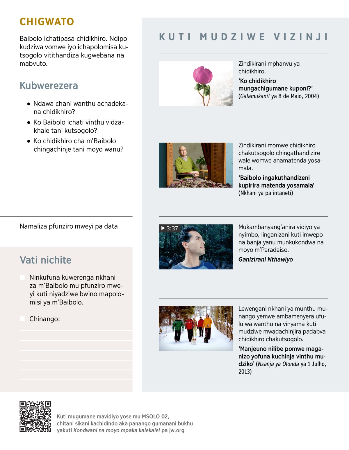 Wanthu azinji achakhala wokwinyirira na waukali ndawa ya mabvuto yomwe achawona mudziko. Anango ayesesa kuti vinthu vichinje. Wonani momwe polomisi ya m’Baibolo yakuti vinthu vidzachinje inkuthandizira wanthu azinji. Wonesani VIDIYO, ndipo patsogolo pake kambiranani mibvunzo aya: