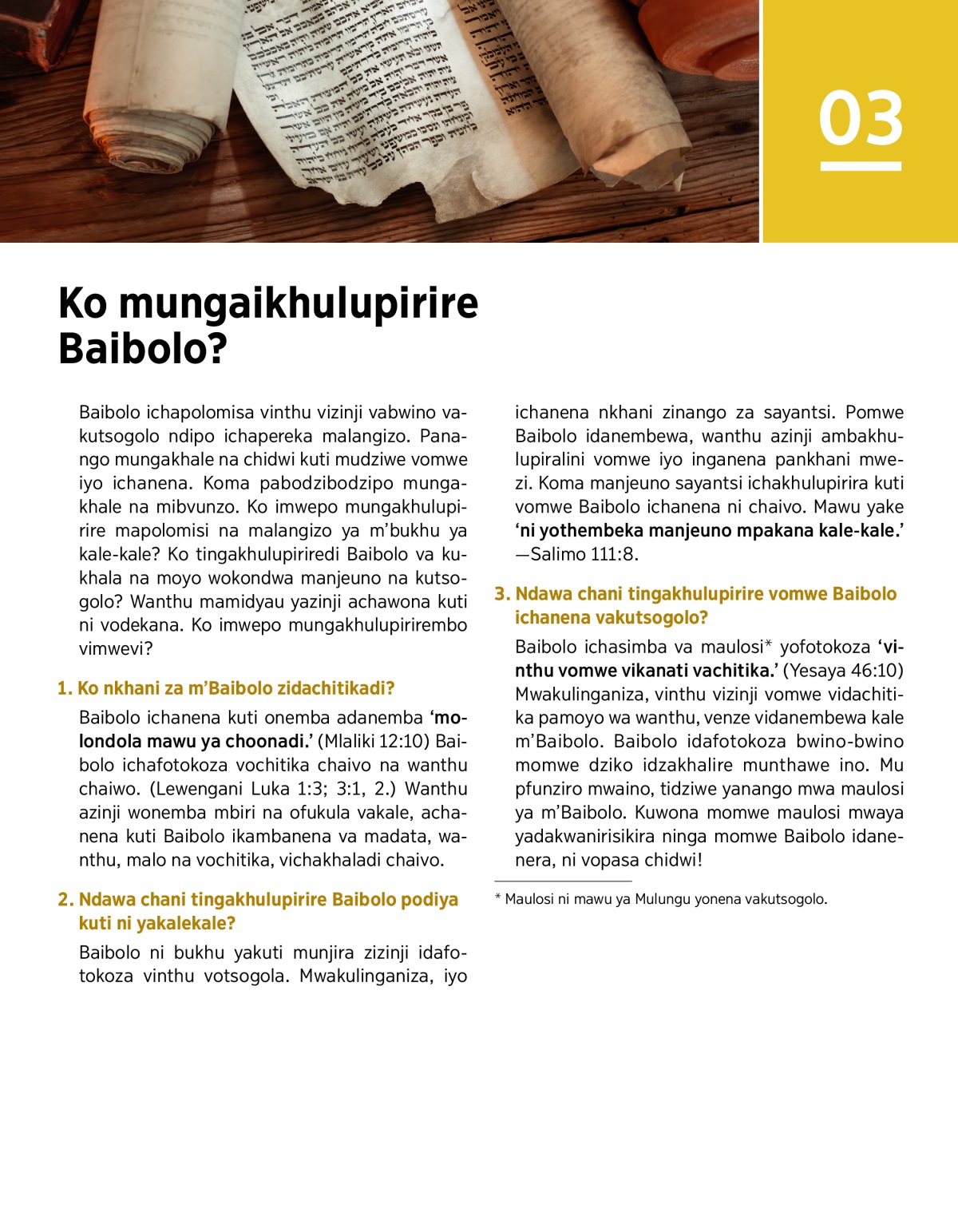 Baibolo ichasimba va maulosia yofotokoza ‘vinthu vomwe vikanati vachitika.’ (Yesaya 46:10) Mwakulinganiza, vinthu vizinji vomwe vidachitika pamoyo wa wanthu, venze vidanembewa kale m’Baibolo. Baibolo idafotokoza bwino-bwino momwe dziko idzakhalire munthawe ino. Mu pfunziro mwaino, tidziwe yanango mwa maulosi ya m’Baibolo. Kuwona momwe maulosi mwaya yadakwanirisikira ninga momwe Baibolo idanenera, ni vopasa chidwi!
