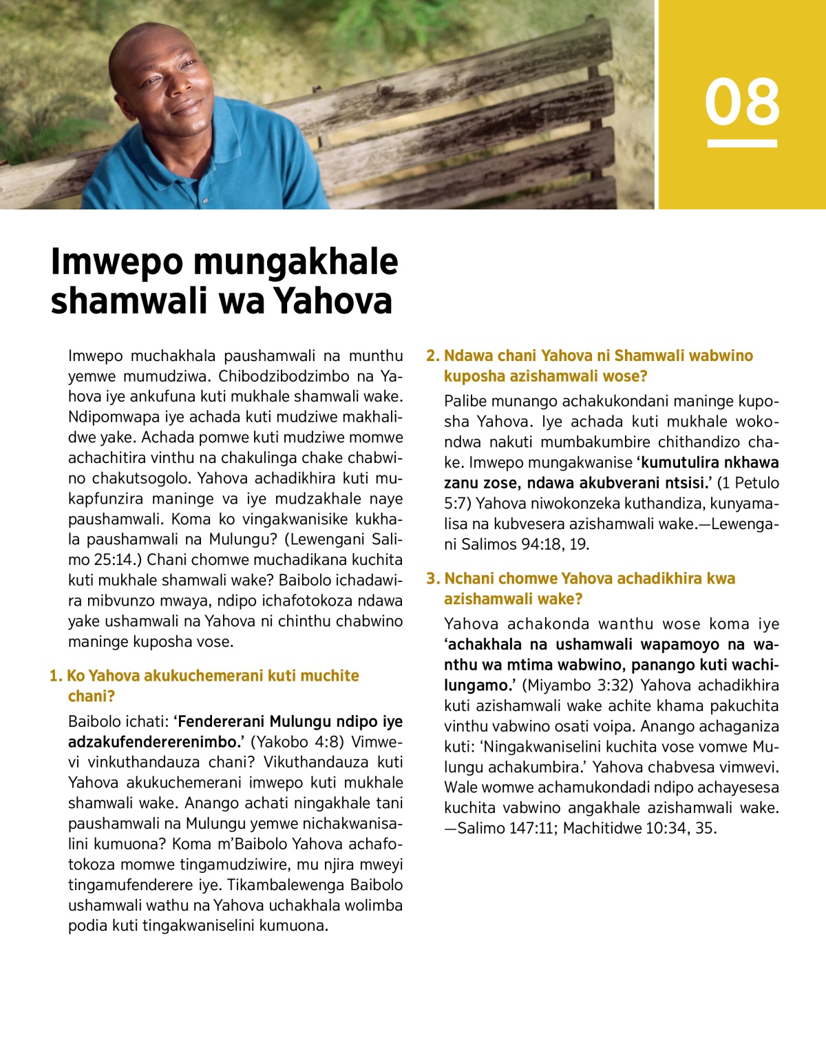 Imwepo muchakhala paushamwali na munthu yemwe mumudziwa. Chibodzibodzimbo na Yahova iye ankufuna kuti mukhale shamwali wake. Ndipomwapa iye achada kuti mudziwe makhalidwe yake. Achada pomwe kuti mudziwe momwe achachitira vinthu na chakulinga chake chabwino chakutsogolo. Yahova achadikhira kuti mukapfunzira maninge va iye mudzakhale naye paushamwali. Koma ko vingakwanisike kukhala paushamwali na Mulungu? (Lewengani Salimo 25:14.) Chani chomwe muchadikana kuchita kuti mukhale shamwali wake? Baibolo ichadawira mibvunzo mwaya, ndipo ichafotokoza ndawa yake ushamwali na Yahova ni chinthu chabwino maninge kuposha vose.