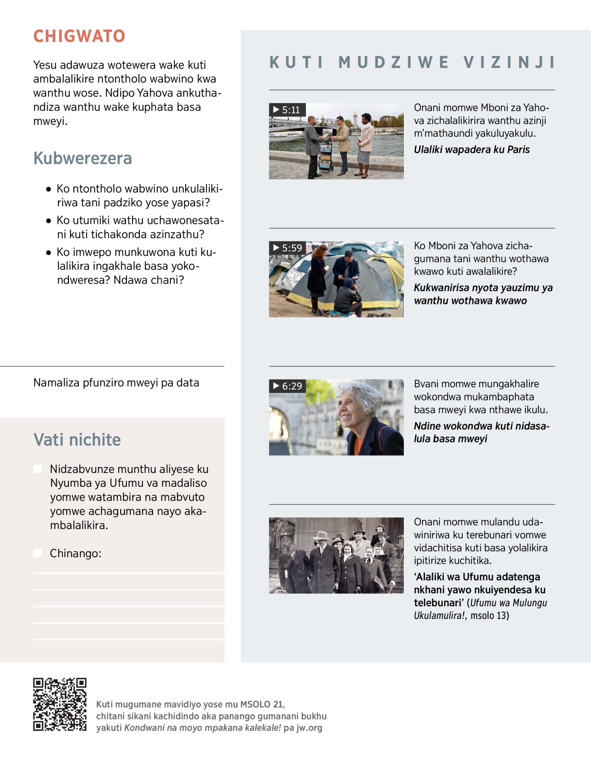 Yesu adati: ‘Ntontholo wabwino wa Ufumu moyu udzalalikiriwe padziko yose yapasi komwe kuna wanthu.’ (Mateyu 24:14) Mboni za Yahova zichakhala zokondwa maninge kuphata basa yodikana mweyi. Tichalalikira ntontholo moyu wabwino padziko yose yapasi mu viseweredwe voposha 1.000. Basa ikulu mweyi ichadikana ngwirizano na khama. Ndipo palibe thandizo ya Yahova basa mweyi ingakwanisikelini.