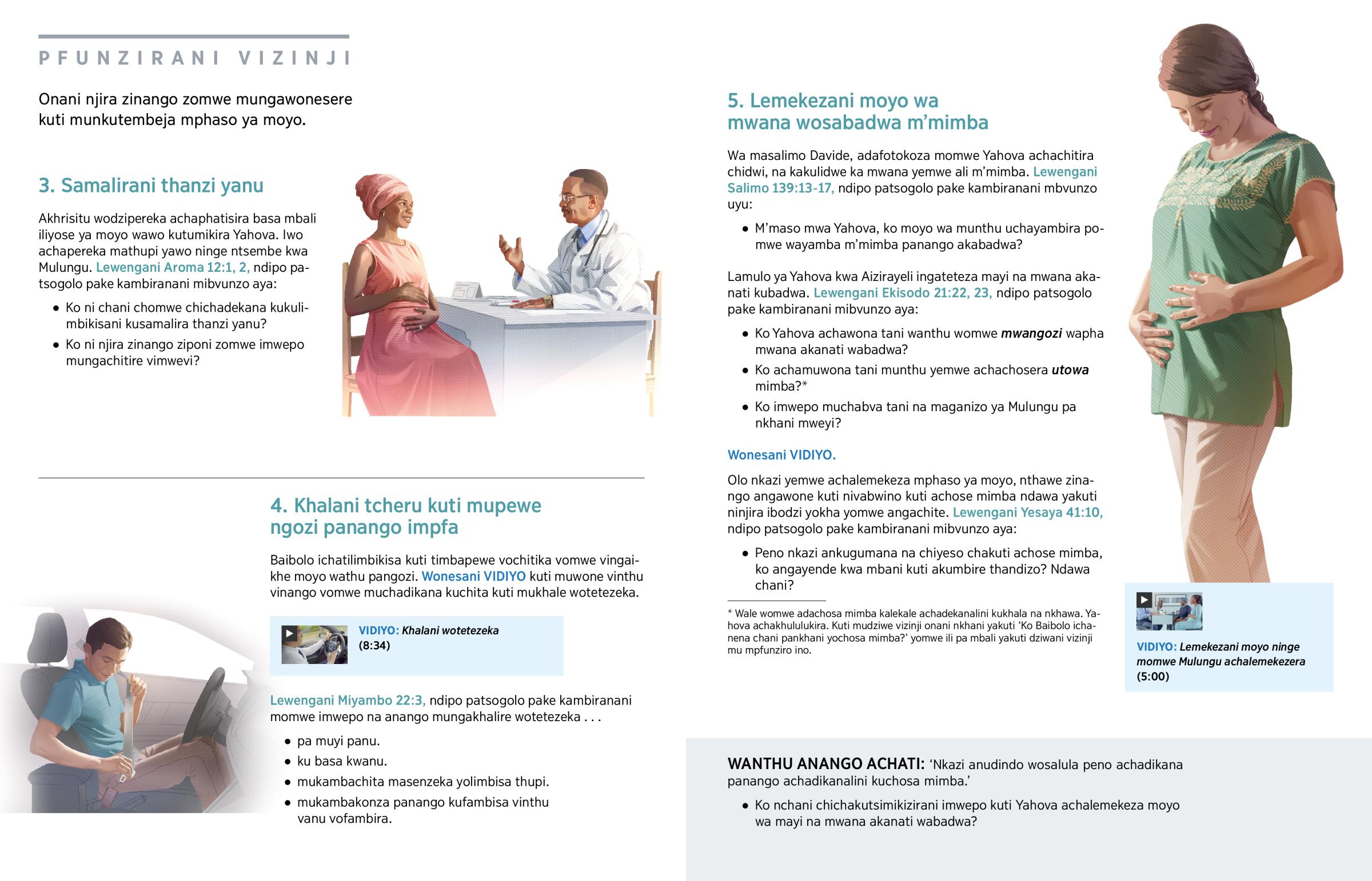 Kundochokera panthawe yomwe mudakonzewa m’mimba, Yahova wakhala ankukusamalirani. Mowuziriwa mtumiki wa Mulungu Davide adalewa kuti: ‘Maso yanu yadaniwona pomwe nenze kacheche m’mimba.’ (Salimo 139:16) Yahova achalemekeza moyo wanu. (Lewengani Mateyu 10:29-31.) Ndipo iye vichamuwawa maninge munthu akapha munzake mochitira utowa, panango akachosa moyo wake mochitira utowa.a (Ekisodo 20:13) Ndipo vichamuwawa pomwe Yahova tikambaikha moyo wathu pangozi panango tikakhala kuti tinkukhalalini tcheru kuti titeze moyo wa wanthu anango. Tikambasamalira moyo wathu na kulemekeza moyo wa anango tichaowenesa kuti tinkulemekeza mphaso yapadera ya moyo.